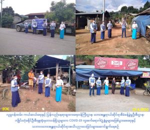 လူမှုဝန်ထမ်း၊ ကယ်ဆယ်ရေးနှင့် ပြန်လည်နေရာချထားရေးဝန်ကြီးဌာန၊ ဘေးအန္တရာယ်ဆိုင်ရာစီမံခန့်ခွဲမှုဦးစီးဌာန၊ ကျိုင်းတုံခရိုင်ဦးစီးမှူးရုံးမှတာဝန်ရှိသူများသည် (၁၉-၉-၂၀၂၀)ရက်နေ့တွင် ကျိုင်းတုံခရိုင် လူမှုဝန်ထမ်းဦးစီးဌာနနှင့်ပူးပေါင်း၍ ကျိုင်းတုံမြို့နယ်၊ မိုင်းပန်လယ်ရွာအုပ်စု၊ မိုင်းပန်လယ်ကျေးရွာ၊ ရွှေညောင်ပင်ကျေးရွာ၊ ဝမ်ကျုံးကျေးရွာ၊ ပန်မက်မွန်ကျေးရွာနှင့် တောင်ခြေကျေးရွာတို့၌ Covid-19 ဒုတိယလှိုင်းကာလအတွင်း ပြည်သူများလိုက်နာရမည့် ကျန်းမာရေးအမူအကျင့်များအသိပညာပေးခြင်းနှင့် သဘာဝဘေးအန္တရာယ်ဆိုင်ရာအသိပညာ ပေးခြင်းများကို Hand Speaker အသံချဲ့စက်များဖြင့်လှည့်လည်ဟောပြောခြင်း၊ Maskနှင့် အသိပညာပေးလက်ကမ်းစာစောင်များ ဖြန့်ဝေပေးခြင်းတို့ကို ဆောင်ရွက်ခဲ့ပါကြောင်း သတင်းရရှိပါသည်။
