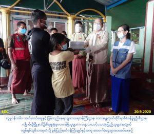 လူမှုဝန်ထမ်း၊ ကယ်ဆယ်ရေးနှင့် ပြန်လည်နေရာချထားရေးဝန်ကြီးဌာန၊ ဘေးအန္တရာယ်ဆိုင်ရာစီမံခန့်ခွဲမှုဉီးစီးဌာန၊ ကျိုက်ထိုမြို့နယ်ဦးစီးမှူးရုံးမှတာဝန်ရှိသူများသည် (၂၀-၉-၂၀၂၀)ရက်နေ့၊ (၀၇:၃၀)အချိန်ခန့်တွင် စစ်တောင်းမြစ်ပင်လယ်ဒီရေရိုက်ခတ်မှုကြောင့် ကျိုက်ထိုမြို့နယ်၊ စစ်တောင်းကျေးရွာ၌ ထရံကာ၊ တောင်ထန်းမိုး၊ ဝါးခင်းနေအိမ်(၁)လုံးနှင့် လူ(၃)ဦးမျောပါ သေဆုံးခဲ့ရာ အဆိုပါဖြစ်စဉ်ကြောင့် အိမ်ဆောက်ပစ္စည်းဖိုးထောက်ပံ့ငွေ(၁၀၀,၀၀ဝ/-)ကျပ်၊ သေဆုံးသူ(၃)ဦးအတွက်ထောက်ပံ့ငွေ(၉၀၀,၀၀ဝ/-)ကျပ်၊စုစုပေါင်းထောက်ပံ့ငွေ(၁,၀၀၀,၀၀၀/-)ကျပ်၊ Family Kit(၁)ထုပ်၊ ပလပ်စတစ်ရေပုံး(၂)ပုံးနှင့် ကယ်ဆယ်ရေးပစ္စည်း(၁၇)မျိုး တန်ဖိုးငွေကျပ်(၄၀,၃၅၃/-)အား (၂၀-၉-၂၀၂၀)ရက်နေ့၊ (၁၁:၀၀)အချိန်ခန့်တွင် ကျန်ရစ်သူ မိသားစုထံသို့ မွန်ပြည်နယ်ဝန်ကြီးချုပ်နှင့်အတူ ထောက်ပံ့ပေးအပ်ခဲ့ပါကြောင်း သတင်းရရှိပါသည်။