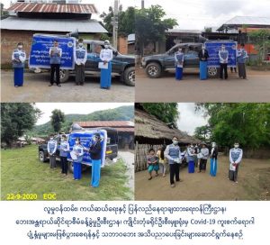 လူမှုဝန်ထမ်း၊ ကယ်ဆယ်ရေးနှင့် ပြန်လည်နေရာချထားရေးဝန်ကြီးဌာန၊ ဘေးအန္တရာယ်ဆိုင်ရာစီမံခန့်ခွဲမှုဦးစီးဌာန၊ ကျိုင်းတုံခရိုင်ဦးစီးမှူးရုံးမှ တာဝန်ရှိသူများသည် ကျိုင်းတုံခရိုင် လူမှုဝန်ထမ်းဦးစီးဌာနနှင့် ပူးပေါင်း၍ (၂၂-၉-၂၀၂၀) ရက်နေ့၌ ကျိုင်းတုံမြို့နယ်၊ ပန်မတ်ကျေးရွာအုပ်စု၊ ပန်မတ်ကျေးရွာ၊ နာဖီးဒယ်ကျေးရွာ၊ ၀မ်ကြုံးကျေးရွာ၊ အားကျီးဖီကျေးရွာနှင့် ထောဒယ်ကျေးရွာတို့၌ Covid-19 ဒုတိယလှိုင်းကာလအတွင်း ပြည်သူများ လိုက်နာရမည့် ကျန်းမာရေးအမူအကျင့်များ အသိပညာပေးခြင်းနှင့် သဘာဝဘေးအန္တရာယ်ဆိုင်ရာ အသိပညာပေးခြင်းများကို Hand Speaker အသံချဲ့စက်များဖြင့် လှည့်လည်ဟောပြောခြင်း၊ Mask နှင့် အသိပညာပေးလက်ကမ်းစာစောင်များ ဖြန့်ပေးဝေခြင်းတို့အား ဆောင်ရွက်ခဲ့ပါကြောင်း သတင်းရရှိပါသည်။