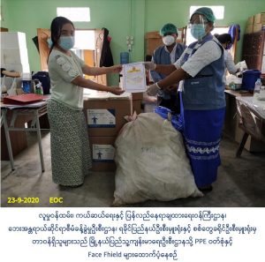 လူမှုဝန်ထမ်း၊ ကယ်ဆယ်ရေးနှင့် ပြန်လည်နေရာချထားရေးဝန်ကြီးဌာန၊ ဘေးအန္တရာယ်ဆိုင်ရာစီမံခန့်ခွဲမှုဦးစီးဌာန၊ ရခိုင်ပြည်နယ်ဦးစီးမှူးရုံးနှင့် စစ်တွေခရိုင်ဦးစီးမှူးရုံးမှ တာဝန်ရှိသူများသည် Covid-19 ရောဂါ ကာကွယ်နှိမ်နင်းရေးလုပ်ငန်းများ ဆောင်ရွက်ရာတွင် ပြည်သူ့ကျန်းမာရေးလုပ်ငန်းများကို အကျိုးပြုစေရေးအတွက် PPE ဝတ်စုံ (၁၀၀)နှင့် Face Fhield အခု(၅၀၀)တို့ကို (၂၃-၉-၂၀၂၀) ရက်နေ့တွင် မြို့နယ်ပြည်သူ့ကျန်းမာရေးဦးစီးဌာနမှူးထံသို့ ပြောင်းထောက်ပံ့ပေးအပ်ခဲ့ပါ ကြောင်း သတင်းရရှိပါသည်။