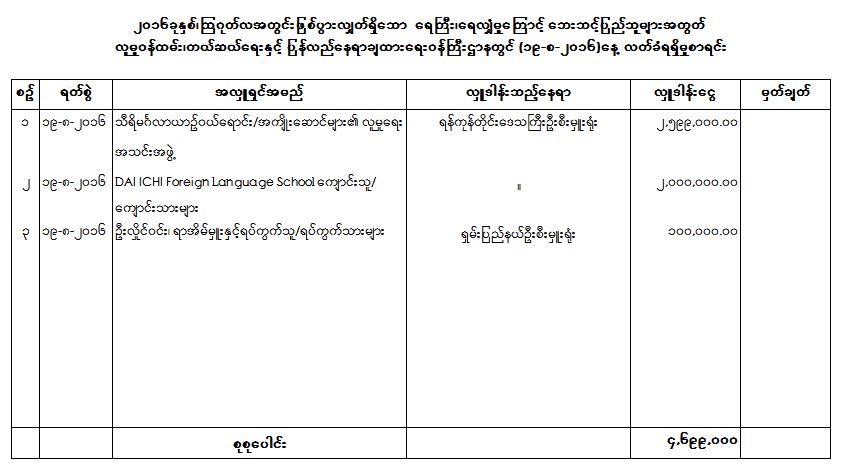၂၀၁၆ခုနှစ်၊သြဂုတ်လအတွင်းဖြစ်ပွားလျှက်ရှိသော ရေကြီး၊ရေလျှံမှုကြောင့် ဘေးသင့်ပြည်သူများအတွက် လူမှုဝန်ထမ်း၊ကယ်ဆယ်ရေးနှင့် ပြန်လည်နေရာချထားရေးဝန်ကြီးဌာနတွင် (၁၈-၈-၂၀၁၆)နေ့ တွင် အလှူငွေလက်ခံရရှိမှုစာရင်း