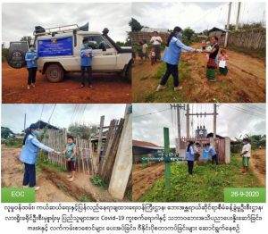 (၂၆-၉-၂၀၂၀)ရက်နေ့ ညနေပိုင်းတွင် လူမှုဝန်ထမ်း၊ ကယ်ဆယ်ရေးနှင့်ပြန်လည်နေရာချထားရေးဝန်ကြီးဌာန၊ လူမှုဝန်ထမ်းဦးစီးဌာန၊ ပြန်လည်ထူထောင်ရေးဦးစီးဌာနနှင့် ဘေးအန္တရာယ်ဆိုင်ရာစီမံခန့်ခွဲမှုဦးစီးဌာန၊ လားရှိုးခရိုင်ဦးစီးမှူးရုံးမှ တာဝန်ရှိသူများသည်၊ လားရှိုးမြို့နယ်ကြက်ခြေနီအသင်း၊ ပြန်ကြားရေးနှင့်ပြည်သူ့ဆက်ဆံရေးဦးစီးဌာန၊ ထွေထွေအုပ်ချုပ်ရေးဦးစီးဌာနတို့နှင့်ပူးပေါင်း၍ လားရှိုးမြို့နယ်၊ မန်းပွဲကျေးရွာအုပ်စု၊ ကုလားကုန်းကျေးရွာ၊ စျေးကုန်းကျေးရွာ၊ ခိုလိတ်ကျေးရွာတို့၌ COVID-19 ကူးစက်မှုမဖြစ်ပွားစေရန် ပြည်သူများ လိုက်နာရမည့်ကျန်းမာရေးအမူအကျင့်များ အသိပညာပေးခြင်းနှင့် သဘာဝဘေးဆိုင်ရာအသိပညာပေးခြင်းများကို အသံချဲ့စက်များဖြင့် လှည့်လည်ဟောပြောခဲ့ပြီး Mask နှင့် COVID-19 ကာကွယ်နိုင်ရန် နှာခေါင်းစည်းကို အသုံးပြုခြင်းဆိုင်ရာ အကြံပြုချက်များ၊ နှာခေါင်စည်းကိုအသုံးပြုရာတွင် လိုက်နာရမည့် အချက်များ၊ COVID-19 ကာကွယ်ရေး စနစ်ကျလက်ဆေးပေး ပါဝင်သည့် လက်ကမ်းစာစောင်များ ဖြန့်ပေးဝေခြင်း၊ Hand Gelများဖြင့် လက်သန့်စင်ပေးခြင်း၊အပူချိန်တိုင်းကိရိယာဖြင့် ကိုယ်အပူချိန်တိုင်းပေးခြင်းတို့အား ဆောင်ရွက်ခဲ့ကြောင်း သတင်းရရှိပါသည်။