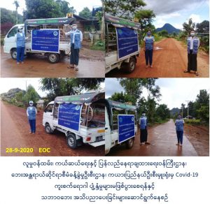 လူမှုဝန်ထမ်း၊ ကယ်ဆယ်ရေးနှင့် ပြန်လည်နေရာချထားရေးဝန်ကြီးဌာန၊ ဘေးအန္တရာယ်ဆိုင်ရာစီမံခန့်ခွဲမှုဦးစီးဌာန၊ ကယားပြည်နယ်ဦးစီးမှူးရုံးမှ တာဝန်ရှိသူများသည် (၂၈-၉-၂၀၂၀) ရက်နေ့တွင် ဒီးမော့ဆိုမြို့နယ်၊ လွိုင်နန်းဖကျေးရွာအုပ်စု၊ လွိုင်နန်းဖကျေးရွာ၊ မြလဲကျေးရွာအုပ်စု၊ ဆီးမီဆိုဒါးကျေးရွာနှင့် ဆီးမီဆိုလားကျေးရွာ၊ ဒေါတော်ကူးကျေးရွာအုပ်စု၊ ဆီးပူကုန်း ကျေးရွာ၊ ဆောင်ဒူလာကျေးရွာအုပ်စု၊ ဒိုင်းလင်းအေးသာကျေးရွာများရှိ ပြည်သူများအား Covid-19 ကူးစက်ရောဂါ ပျံ့နှံ့မှုများ မဖြစ်ပွားစေရန်နှင့် သဘာဝဘေးအန္တရာယ်နှင့်စပ်လျဉ်းသည့် ဆောင်ရန်၊ ရှောင်ရန်များကို အသိပညာဖြန့်ဝေခဲ့ပါကြောင်း သတင်းရရှိပါသည်။