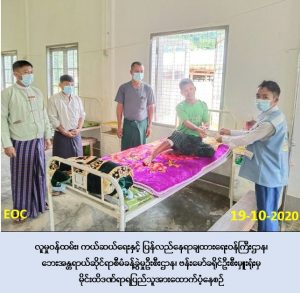 လူမှုဝန်ထမ်း၊ ကယ်ဆယ်ရေးနှင့် ပြန်လည်နေရာချထားရေးဝန်ကြီးဌာန၊ ဘေးအန္တရာယ်ဆိုင်ရာ စီမံခန့်ခွဲမှုဦးစီးဌာန၊ ဗန်းမော်ခရိုင်ဦးစီးမှူးရုံးမှ တာဝန်ရှိသူများသည် (၁၈-၁၀-၂၀၂၀) ရက်နေ့၌ ဗန်းမော်ခရိုင်၊ မိုးမောက်မြို့နယ်၊ ဒေါ့ဖုန်းယန်မြို့၊ အမှတ် (၁) ရပ်ကွက်မှ မိုင်းထိမှန်ဒဏ်ရာ ရသူ (၁) ဦးလျှင်(၅၀,၀၀ဝ/-) ကျပ်နှုန်းဖြင့် ဒဏ်ရာရသူ (၂) ဦးအား စုစုပေါင်းထောက်ပံ့ငွေ (၁၀၀,၀၀ဝ/-) ကျပ်ကို (၁၉-၁၀-၂၀၂၀) ရက်နေ့၊ နေ့လည် (၁၂:၀၀) နာရီအချိန်၌ ဒဏ်ရာ ရရှိသူများထံသို့ လက်ဝယ်အရောက် သွားရောက်ထောက်ပံ့ခဲ့ကြောင်း သတင်းရရှိပါသည်။