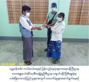 လူမှုဝန်ထမ်း၊ ကယ်ဆယ်ရေးနှင့် ပြန်လည်နေရာချထားရေးဝန်ကြီးဌာန၊ ဘေးအန္တရာယ်ဆိုင်ရာစီမံခန့်ခွဲမှုဦးစီးဌာန၊ မအူပင်ခရိုင်ဦးစီးမှူးရုံးမှ တာဝန်ရှိသူများသည် (၂၀-၁၀-၂၀၂၀) ရက်နေ့၌ မအူပင်ခရိုင်၊ မအူပင်မြို့နယ်၊ ကျွဲဒုံးကျေးရွာအုပ်စု၊ ကျွဲသောင်ကျေးရွာတွင် ဖြစ်ပွားခဲ့သော ကမ်းပြိုဘေးကြောင့် ကြိုတင်ဖျက်သိမ်းပြောင်းရွှေ့ခဲ့သည့် နေအိမ် (၁) လုံး၊ အိမ်ထောင်စု (၁) စုမှ လူဦးရေ (၂) ဦးအတွက် အိမ်ဆောက်ပစ္စည်းဖိုးထောက်ပံ့ငွေ (၁၀၀၀၀၀/-) ကျပ်၊ ဆန်ရိက္ခာ(၇)ရက်စာဖိုးထောက်ပံ့ငွေ (၄၂၀၀/-) ကျပ်၊ စုစုပေါင်းကယ်ဆယ်ရေးရန်ပုံငွ (၁၀၄၂၀၀/-) ကျပ်အား (၂၁-၁၀-၂၀၂၀) ရက်နေ့၊ (၁၂:၀၀) နာရီအချိန်တွင် ဘေးသင့်ပြည်သူများလက်ဝယ်အရောက် ထောက်ပံ့ပေးခဲ့ပါကြောင်း သတင်းရရှိပါသည်။