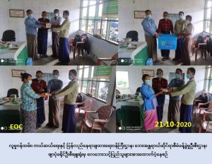 လူမှုဝန်ထမ်း၊ ကယ်ဆယ်ရေးနှင့် ပြန်လည်နေရာချထားရေးဝန်ကြီးဌာန၊ ဘေးအန္တရာယ်ဆိုင်ရာ စီမံခန့်ခွဲမှုဦးစီးဌာန၊ ဖျာပုံခရိုင်ဦးစီးမှူးရုံးမှ တာဝန်ရှိသူများသည် ဖျာပုံမြို့နယ်၊ နောက်မီးကျေးရွာ အုပ်စု၊ မင်္ဂလာသောင်တန်းကျေးရွာနှင့် ဦးပေကျေးရွာတို့၌(၂၀-၁၀-၂၀၂၀) ရက်နေ့တွင်လေပြင်းတိုက်ခတ်ပြီး ပင်လယ်ဒီရေမြင့်တက်မှုကြောင့် တစိတ်တစ်ပိုင်းပျက်စီး နေအိမ် (၁၅၂)လုံးနှင့် ပြိုကျပျက်စီးနေအိမ်(၁)လုံး အတွက် အိမ်ဆောက်ပစ္စည်းဖိုးထောက်ပံ့ငွေ (၅,၄၂၀,၀၀ဝ/-)ကျပ်၊ လူဦးရေ(၆၈၂)ဦးအတွက် ဆန်ရိက္ခာ(၇)ရက်စာ ထောက်ပံ့ငွေ (၁,၄၃၂,၂၀ဝ/-)ကျပ်၊ စုစုပေါင်းထောက်ပံ့ငွေ(၆,၈၅၂,၂၀ဝ/-)ကျပ် နှင့်ကယ်ဆယ်ရေးပစ္စည်း (၁၆)မျိုး (၁) အိမ်ထောင်စာတို့အား (၂၁-၁၀-၂၀၂၀) ရက်နေ့၊ နေ့လည်(၂:၀၇)နာရီအချိန်တွင် နောက်မီးကျေးရွာအုပ်ချုပ်ရေးရုံး၌ရပ်ကွက်ကျေးရွာအုပ်ချုပ်ရေးမှူးနှင့် တာဝန်ရှိသူများ၏ ရှေ့မှောက်တွင် ဘေးသင့်ပြည်သူများ လက်ဝယ်သို့ထောက်ပံ့ပေးအပ်ခဲ့ကြောင်း သတင်း ရရှိပါသည်။