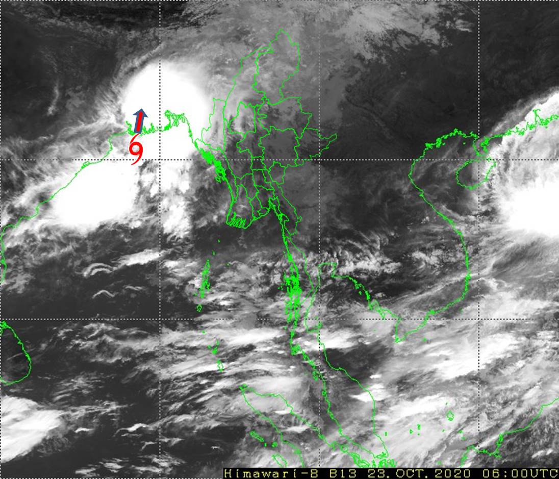 (၁) ယနေ့မြန်မာစံတော်ချိန်(၁၂:၃၀)နာရီအချိန် တိုင်းထွာချက်များအရ ဘင်္ဂလား ပင်လယ်အော်အနောက်မြောက်ပိုင်း (အိန္ဒိယနိုင်ငံ၊ အနောက်ဘင်္ဂလားပြည်နယ် ကမ်းလွန်- ဘင်္ဂလားဒေ့ရှ်နိုင်ငံကမ်းခြေ)တို့တွင် ဖြစ်ပေါ်နေသော မုန်တိုင်းငယ် (Depression)သည် မြောက်-အရှေ့မြောက်ဘက်သို့ ရွေ့လျားခဲ့ပြီး၊ အိန္ဒိယနိုင်ငံ၊ ဆာဂါ(Sagar)ကျွန်း၏ အရှေ့တောင်ဘက် ရေမိုင် (၃၀)မိုင်ခန့်၊ ဘင်္ဂလားဒေ့ရှ် နိုင်ငံ၊ ခီပူပါရာ (Khepupara)မြို့၏ အနောက်တောင်ဘက် ရေမိုင် (၁၁၀)မိုင်ခန့် နှင့် မြန်မာနိုင်ငံ၊ မောင်တောမြို့၏ အနောက်ဘက် ရေမိုင် (၂၂၅)မိုင်ခန့်အကွာ ပင်လယ်ပြင်ကို ဗဟိုပြုနေပါသည်။