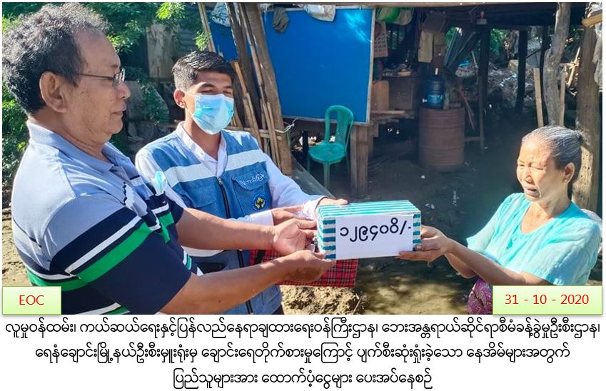 လူမှုဝန်ထမ်း၊ ကယ်ဆယ်ရေးနှင့်ပြန်လည်နေရာချထားရေးဝန်ကြီးဌာန၊ ဘေးအန္တရာယ်ဆိုင်ရာစီမံခန့်ခွဲမှုဦးစီးဌာန၊ ရေနံချောင်းမြို့နယ်ဦးစီးမှူးရုံးမှ တာဝန်ရှိသူများသည် မကွေးတိုင်းဒေသကြီး၊ ရေနံချောင်းမြို့၊ မြို့မမြောက်ရပ်ကွက်၊ သပြေတန်းရပ်တွင် (၃၀.၁၀.၂၀၂၀)ရက်နေ့တွင် မိုးသည်းထန်စွာရွာသွန်းမှုကြောင့် ချောင်းရေတိုက်စား၍ တစ်စိတ်တစ်ပိုင်းပျက်စီးနေအိမ်(၂) လုံးအတွက်အိမ်ဆောက်ပစ္စည်းဖိုးငွေ (၁၀၀၀၀၀) ၊ လူဦးရေ(၁၄)ဦးအတွက်ဆန်ရိက္ခါ (၇)ရက်စာ(၂၉၄၀၀)၊စုစုပေါင်းထောက်ပံ့ငွေ(၁၂၉၄၀၀) အား (၃၁-၁၀-၂၀၂၀)ရက်နေ့ (၁၅:၃၀)အချိန်တွင် ဘေးသင့်ပြည်သူများလက်ဝယ်အရောက် ထောက်ပံ့ပေးအပ်ခဲ့ကြောင်း သတင်းရရှိပါသည်။