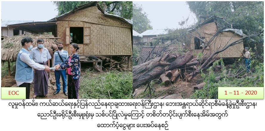 လူမှုဝန်ထမ်း၊ ကယ်ဆယ်ရေးနှင့်ပြန်လည်နေရာချထားရေးဝန်ကြီးဌာန၊ ဘေးအန္တရာယ်ဆိုင်ရာစီမံခန့်ခွဲမှဦးစီးဌာန၊ ညောင်ဦးခရိုင်ဦးစီးမှူးရုံးမှ တာဝန်ရှိသူများသည်(၃၁-၁၀-၂၀၂၀) ရက်နေ့ ညနေ(၁၈:၁၇)အချိန်ခန့်၌ ကျောက်ပန်းတောင်းမြို့ ၊ ဘူတာရပ်ကွက်တွင် မိုးသည်းထန်စွာရွာသွန်းပြီး နေအိမ်အတွင်းရှိ ကန္တာရပင်ပြိုလဲမှုကြောင့် တစိတ်တပိုင်းပျက်စီးနေအိမ် (၁)လုံးမှ လူဦးရေ (၄) ဦးတို့အတွက် ဆန်ရိက္ခာဖိုး (၇) ရက်စာ (၈၄၀၀ိ/-)နှင့် အိမ်ဆောက်ပစ္စည်းဖိုး (၁၀၀,၀၀ဝိ/_)၊ စုစုပေါင်း ကယ်ဆယ်ရေးရန်ပုံငွေ (၁၀၈၄၀ဝိ/_)ကို (၁-၁၁-၂၀၂၀)ရက်နေ့ (၁၂:၀၀) အချိန်၌ ဘေးသင့်ပြည်သူများ၏ လက်ဝယ်အရောက် ထောက်ပံ့ခဲ့ကြောင်း သတင်းရရှိပါသည်။