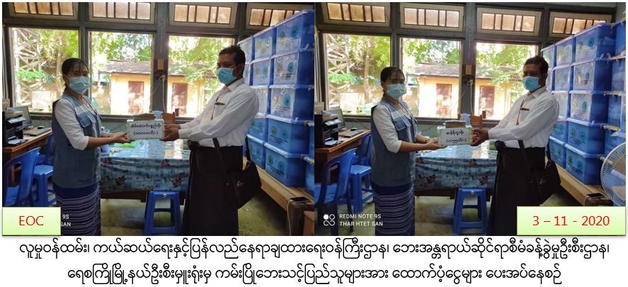 လူမှုဝန်ထမ်း၊ ကယ်ဆယ်ရေးနှင့်ပြန်လည်နေရာချထားရေးဝန်ကြီးဌာန၊ ဘေးအန္တရာယ်ဆိုင်ရာစီမံခန့်ခွဲမှုဦးစီးဌာန၊ ရေစကြိုမြို့နယ်ဦးစီးမှူးရုံးမှ တာဝန်ရှိသူများသည် ရေစကြိုမြို့နယ်၊ အောင်ပန်းချောင်းကျေးရွာအုပ်စု၊ အောင်ပန်းချောင်းကျေးရွာတွင်(၂၈-၁၀-၂၀၂၀)ရက်နေ့၊(၀၈:၃၀)အချိန်၌ ချင်းတွင်းမြစ်ရေတိုက်စားကမ်းပါးပြိုကျမှုကြောင့် ကြိုတင်ဖျက်သိမ်းပြောင်းရွှေ့ခြင်းများ ဆောင်ရွက်ခဲ့ကြရာ ကြိုတင်ဖျက်သိမ်းပြောင်းရွှေ့လူနေအိမ်(၁၀)လုံး၊ အိမ်ထောင်စု(၁၁)စု၊ လူဦးရေ(၅၅)ဦးတို့အတွက် အိမ်ဆောက်ပစ္စည်းဖိုး(၁၀၀၀၀၀ဝိ/-)၊ ဆန်ရိက္ခာဖိုး(၁၁၅၅၀ဝိ/-)၊ စုစုပေါင်းကျပ်(၁၁၁၅၅၀ဝိ/-)အား(၃-၁၁-၂၀၂၀)ရက်နေ့၊ (၁၅:၀၀)အချိန်တွင် ထောက်ပံ့ပေးအပ်ခဲ့ကြောင်း သတင်းရရှိပါသည်။