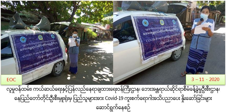 လူမှုဝန်ထမ်း၊ ကယ်ဆယ်ရေးနှင့်ပြန်လည်နေရာချထားရေးဝန်ကြီးဌာန၊ ဘေးအန္တရာယ်ဆိုင်ရာစီမံခန့်ခွဲမှုဦးစီးဌာန၊ ပြည်ထောင်စုနယ်မြေ၊ နေပြည်တော်တိုင်းဦးစီးမှူးရုံးမှ တာဝန်ရှိသူများသည် (၃-၁၁-၂၀၂၀) ရက်နေ့၊ နံနက်(၁၀:၀၀) အချိန်မှ (၁၅:၀၀)အချိန်အထိ ပြည်သူများအား COVID-19 ရောဂါကူးစက်ပြန့်နှံ့မှုများမဖြစ်ပွားစေရန်အတွက် သိရှိလိုက်နာဆောင်ရွက်ရမည့်အချက်များအား ပျဉ်းမနားမြို့နယ်၊မန်ကျည်းတောရပ်ကွက်၊ ပေါင်းလောင်(၁)ရပ်ကွက်၊ ပေါင်းလောင်း(၂)ရပ်ကွက်၊ ဘိုကုန်းရပ်ကွက်၊ ဘိုမင်းခေါင်ရပ်ကွက်၊ ပန်းခင်းရပ်ကွက်ရှိ ပြည်သူများအား အသိပညာပေးခြင်းများ ထိရောက်စွာဆောင်ရွက်ခဲ့ကြောင်း သတင်းရရှိပါသည်။