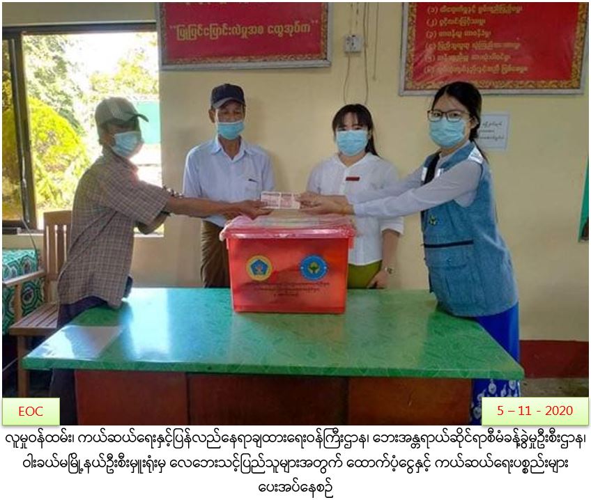 လူမှုဝန်ထမ်း၊ ကယ်ဆယ်ရေးနှင့်ပြန်လည်နေရာချထားရေးဝန်ကြီးဌာန၊ ဘေးအန္တရာယ်ဆိုင်ရာစီမံခန့်ခွဲမှုဦးစီးဌာန၊ ဝါးခယ်မြို့နယ်ဦးစီးမှူးရုံးမှ မြောင်းမြခရိုင်၊ ဝါးခယ်မမြို့နယ်၊ တုံးလှဲချောင်းကျေးရွာအုပ်စု၊ တုံးလှဲချောင်းကျေးရွာတွင် (၃၁.၁၀.၂၀၂၀)ရက်နေ့၌ ဖြစ်ပွားခဲ့သော လေဘေးကြောင့် ပြိုကျပျက်စီးနေအိမ်(၁)လုံးအတွက် ကယ်ဆယ်ရေးပစ္စည်း (၁၇)မျိုး အိမ်ထောင်စု (၁)စုစာ(၃၄၈၅၃)၊ အိမ်ဆောက်ပစ္စည်းရန်ပုံငွေ (၁၀၀၀၀၀ိ/-)၊ တစ်စိတ်တစ်ပိုင်းပျက်စီးနေအိမ် (၁) လုံး၊ အိမ်ဆေက်ပစ္စည်းရန်ပုံငွေ (၇၀၀၀၀ိ/-)၊ စုစုပေါင်းအိမ်ထာင်စု (၃)စုမှ လူဦးရေ(၁၄)ဦးတို့အတွက် အိမ်ဆောက်ပစ္စည်းရန်ပုံငွေ(၁၇၀၀၀ဝိ/-)၊ ဆန်ရိက္ခာရန်ပုံငွေ (၂၉၄၀ဝိ/-)၊ စုစုပေါင်းရန်ပုံငွေ (၁၉၉၄၀ဝိ/-) အား (၅-၁၁-၂၀၂၀) ရက်နေ့၊ (၁၄:၀၀)နာရီအချိန်တွင် ဝါးခယ်မမြို့နယ်၊ ရွှေလောင်းမြို့အုပ်ချုပ်ရေးမှူးရုံးတွင် ဘေးသင့်ပြည်သူများလက်ဝယ်အရောက် ထောက်ပံ့ပေးအပ်ခဲ့ကြောင်း သတင်းရရှိပါသည်။