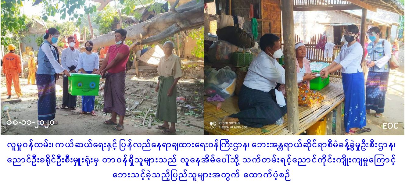 လူမှုဝန်ထမ်း၊ ကယ်ဆယ်ရေးနှင့် ပြန်လည်နေရာချထားရေးဝန်ကြီးဌာန၊ ဘေးအန္တရာယ်ဆိုင်ရာစီမံခန့်ခွဲမှုဦးစီးဌာန၊ ညောင်ဦးခရိုင်ဦးစီးမှူးရုံးမှ တာဝန်ရှိသူများသည် ညောင်ဦးမြို့နယ်၊ အမှတ် (၅) ရပ်ကွက်၊ ဈေးတန်းမြောက်ရပ်၌ (၁၀-၁၁-၂၀၂၀) ရက်နေ့၊ (၀၂:၃၀) နာရီအချိန်တွင် လူနေအိမ်ပေါ်သို့ သက်တမ်းရင့်ညောင်ကိုင်းကျိုးကျခဲ့ပါသဖြင့် လုံးဝပျက်စီးခဲ့သည့် နေအိမ်(၂)လုံး၊ တစ်စိတ်တစ်ပိုင်းပျက်စီးခဲ့သည့်နေအိမ်(၁)လုံး၊ စုစုပေါင်းအိမ်ခြေ(၃)လုံး၊ အိမ်ထောင်စု (၃) စုမှ လူဦးရေ (၂၀)ဦးတို့အတွက် ဆန်ရိက္ခာဖိုးထောက်ပံငွေ (၄၂၀၀၀/-) ကျပ်နှင့် အိမ်ဆောက်ပစ္စည်းဖိုးထောက်ပံ့ငွေ (၃၀၀,၀၀၀/-) ကျပ်၊ ထိခိုက်ဒဏ်ရာရရှိသူ(၂)ဦးအတွက် ထောက်ပံ့ငွေ (၁၀၀၀၀၀/-) ကျပ်၊ စုစုပေါင်းကယ်ဆယ်ရေးရန်ပုံငွေ (၄၄၂၀၀၀/-) ကျပ်တိတိနှင့် ကယ်ဆယ်ရေးပစ္စည်း(၁၈)မျိုးပါ (၁)အိမ်ထောင်စာ၊ ကယ်ဆယ်ရေးပစ္စည်း(၁၇)မျိုးပါ (၁)အိမ်ထောင်စာတို့ကို (၁၀-၁၁-၂၀၂၀) ရက်နေ့၊ (၁၄:၀၀) နာရီအချိန်တွင် ဘေးသင့်ပြည်သူများ၏ လက်ဝယ်အရောက် သွားရောက်ထောက်ပံ့ခဲ့ကြောင်း သတင်းရရှိပါသည်။