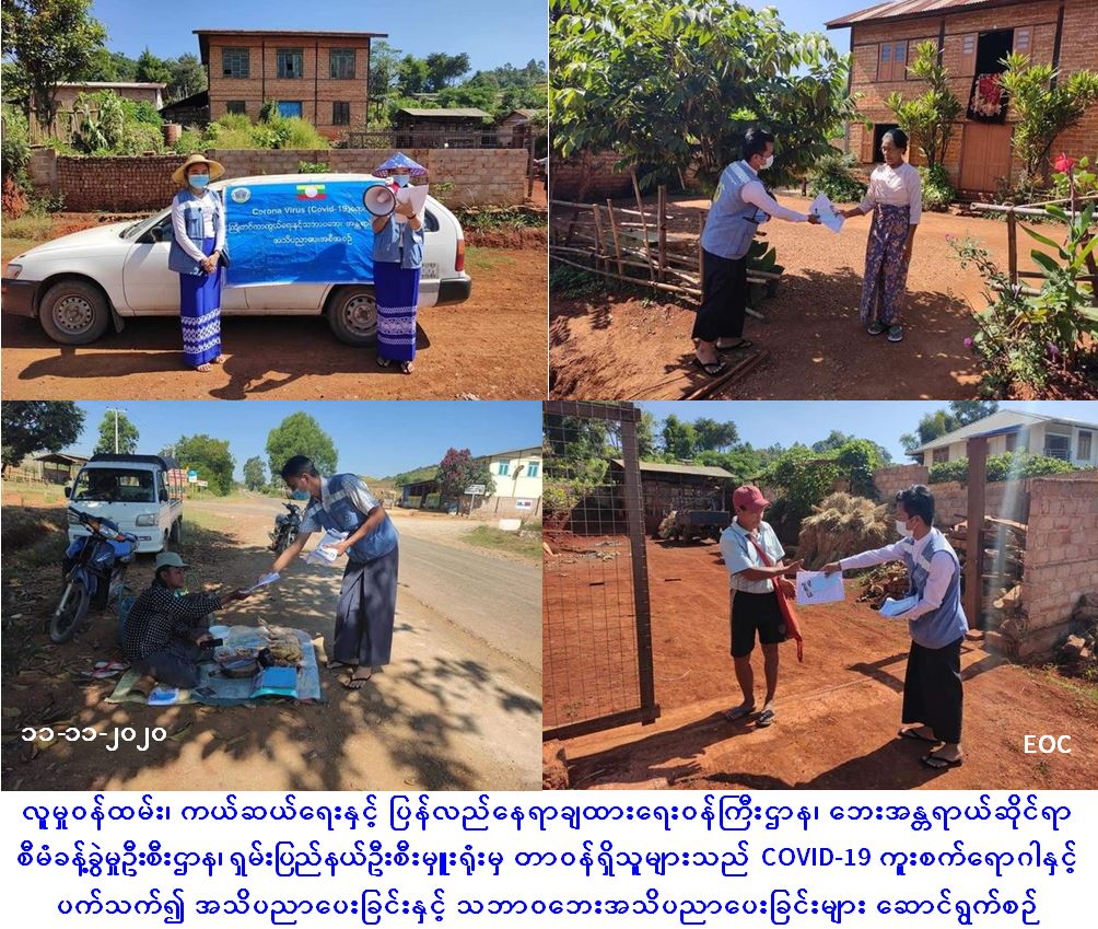 လူမှုဝန်ထမ်း၊ ကယ်ဆယ်ရေးနှင့် ပြန်လည်နေရာချထားရေးဝန်ကြီးဌာန၊ ဘေးအန္တရာယ်ဆိုင်ရာစီမံခန့်ခွဲမှုဦးစီးဌာန၊ ရှမ်းပြည်နယ်ဦးစီးမှူးရုံးမှ တာဝန်ရှိသူများသည် (၁၁-၁၁-၂၀၂၀) ရက်နေ့၊ နံနက်ပိုင်းတွင် ကလောမြို့နယ်၊ တောင်ပတ်ကျေးရွာနှင့် မြောက်မြေခြားကျေးရွာများအတွင်း COVID-19 ဒုတိယလှိုင်းကာလအတွင်း ပြည်သူများ လိုက်နာရမည့်ကျန်းမာရေးအမူအကျင့်များ အသိပညာပေးခြင်းနှင့် သဘာဝဘေးဆိုင်ရာ အသိပညာပေးခြင်းများကို Hand Speaker အသံချဲ့စက်များဖြင့် လှည့်လည်ဟောပြောခြင်း၊ Mask နှင့် အသိပညာပေးလက်ကမ်းစာစောင်များ ဖြန့်ပေးဝေခြင်းတို့အား ဆောင်ရွက်ခဲ့ကြောင်း သတင်းရရှိပါသည်။