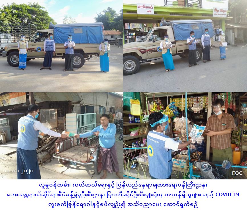 လူမှုဝန်ထမ်း၊ ကယ်ဆယ်ရေးနှင့် ပြန်လည်နေရာချထားရေးဝန်ကြီးဌာန၊ ဘေးအန္တရာယ်ဆိုင်ရာစီမံခန့်ခွဲမှုဦးစီးဌာန၊ မြဝတီခရိုင်ဦးစီးမှူးရုံးမှ တာဝန်ရှိသူများသည် မြဝတီခရိုင်လူမှုဝန်ထမ်းဦးစီးဌာနနှင့်ပူးပေါင်း၍ (၁၁-၁၁-၂၀၂၀) ရက်နေ့၊ (၁၃:ဝဝ) နာရီမှ (၁၆:၃၀) နာရီအချိန်ထိ မြဝတီမြို့အမှတ် (၁)၊ (၂)၊ (၃)၊ (၅)ရပ်ကွက်များအတွင်း Covid-19 အသက်ရှူလမ်းကြောင်းဆိုင်ရာ ကူးစက်ရောဂါနှင့်ပတ်သက်၍ အများပြည်သူများသိရှိလိုက်နာရန် ကျန်းမာရေးနှင့်အားကစားဝန်ကြီးဌာနမှ ထုတ်ပြန်ထားသော အသိပေးကြေငြာချက်များအား လှည့်လည်အသိပညာပေးခြင်းနှင့် Covid-19 အသိပညာပေးလက်ကမ်းစာစောင်များ ဝေငှခြင်းတို့ကို ဆောင်ရွက်ခဲ့ကြကြောင်း သတင်းရရှိပါသည်။