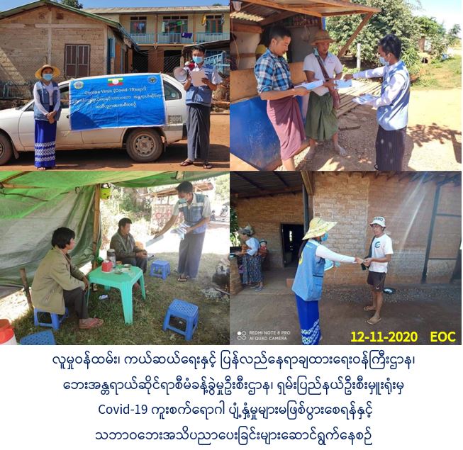 လူမှုဝန်ထမ်း၊ ကယ်ဆယ်ရေးနှင့် ပြန်လည်နေရာချထားရေးဝန်ကြီးဌာန၊ ဘေးအန္တရာယ်ဆိုင်ရာစီမံခန့်ခွဲမှုဦးစီးဌာန၊ ရှမ်းပြည်နယ်ဦးစီးမှူးရုံးမှ တာဝန်ရှိသူများသည် (၁၂-၁၁-၂၀၂၀) ရက်နေ့၌ ကလောမြို့နယ်၊ ရေဘုတ်ကျေးရွာနှင့် လေးကျောင်းတိုက်ကျေးရွာတို့တွင် ပြည်သူများအား Covid-19 ကူးစက်ရောဂါ ပျံ့နှံ့မှုများ မဖြစ်ပွားစေရန်နှင့် သဘာဝဘေး အန္တရာယ်နှင့်စပ်လျဉ်းသည့် ဆောင်ရန်၊ ရှောင်ရန်များကို Hand Speaker အသံချဲ့စက်များဖြင့် လှည့်လည်ဟောပြောခြင်း၊ Mask နှင့် အသိပညာပေးလက်ကမ်းစာစောင်များ ဖြန့်ပေးဝေခြင်းတို့အား ဆောင်ရွက်ခဲ့ပါကြောင်း သတင်းရရှိပါသည်။