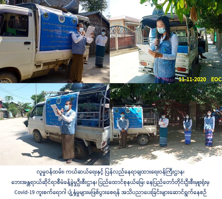 လူမှုဝန်ထမ်း၊ ကယ်ဆယ်ရေးနှင့် ပြန်လည်နေရာချထားရေးဝန်ကြီးဌာန၊ ဘေးအန္တရာယ်ဆိုင်ရာစီမံခန့်ခွဲမှုဦးစီးဌာန၊ ပြည်ထောင်စုနယ်မြေ၊ နေပြည်တော်တိုင်းဦးစီးမှူးရုံးမှ တာဝန်ရှိသူများသည် ပြန်ကြားရေးနှင့် ပြည်သူ့ဆက်ဆံရေးဦးစီးဌာနနှင့် ပူးပေါင်း၍ (၁၁-၁၁-၂၀၂၀) ရက်နေ့၊ (၁၀:၀၀) အချိန်မှ (၁၅:၀၀) အချိန်အထိ ပြည်သူများအား COVID-19 ရောဂါ ကူးစက်ပြန့်နှံ့မှုများမဖြစ်ပွားစေရန်အတွက် သိရှိလိုက်နာဆောင်ရွက်ရမည့်အချက်များအား ဒက္ခိဏသီရိမြို့နယ်၊ ရွှေအင်ကြင်း ရပ်ကွက်၊ ရန်အောင်မြင်ကျေးရွာအုပ်စု၊ ရွာမကျေးရွာ၊ တပ်ပိုးကျေးရွာ၊ ပေါက်တောကျေးရွာ၊ ဇီးဖြူကုန်းကျေးရွာများ အတွင်းရှိ ပြည်သူများအား အသိပညာပေးခြင်းလုပ်ငန်းကို ထိရောက်စွာ ဆောင်ရွက်ခဲ့ပါကြောင်း သတင်းရရှိပါသည်။