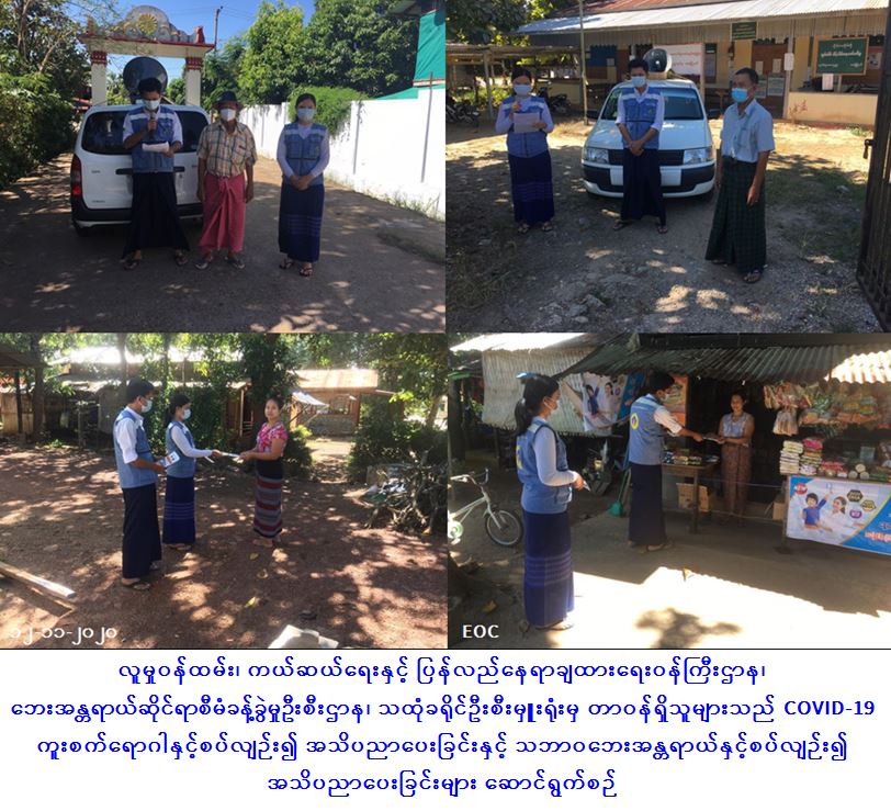 လူမှုဝန်ထမ်း၊ ကယ်ဆယ်ရေးနှင့် ပြန်လည်နေရာချထားရေးဝန်ကြီးဌာန၊ ဘေးအန္တရာယ်ဆိုင်ရာစီမံခန့်ခွဲမှုဦးစီးဌာန၊ သထုံခရိုင်ဦးစီးမှူးရုံးမှ တာဝန်ရှိသူများသည် (၁၂-၁၁-၂၀၂၀) ရက်နေ့၊ (၁၀:၀၀)နာရီအချိန်မှ (၁၃:၀၀) နာရီအချိန်ထိ မွန်ပြည်နယ်၊ သထုံခရိုင်၊ သထုံမြို့နယ်၊ နောင်ကုလားကျေးရွာအုပ်စုအတွင်းရှိ ပြည်သူများအား Covid-19 ကူးစက်ရောဂါ ပျံ့နှံ့မှုများမဖြစ်ပွားစေရန် အသိပညာပေးခြင်း၊ သဘာဝဘေးအန္တရာယ်နှင့်စပ်လျဉ်း၍ ဆောင်ရန်/ ရှောင်ရန် အချက်များအား အသိပညာပေးခြင်းနှင့် လက်ကမ်းစာစောင်များ ဖြန့်ဝေခြင်းတို့ ဆောင်ရွက်ခဲ့ကြောင်း သတင်းရရှိပါသည်။