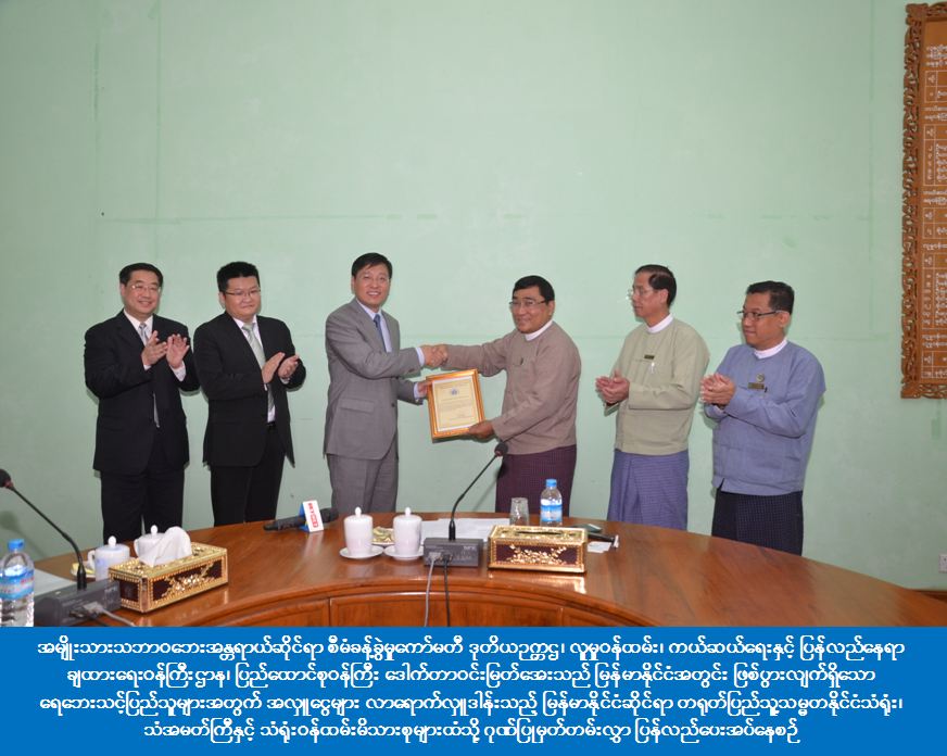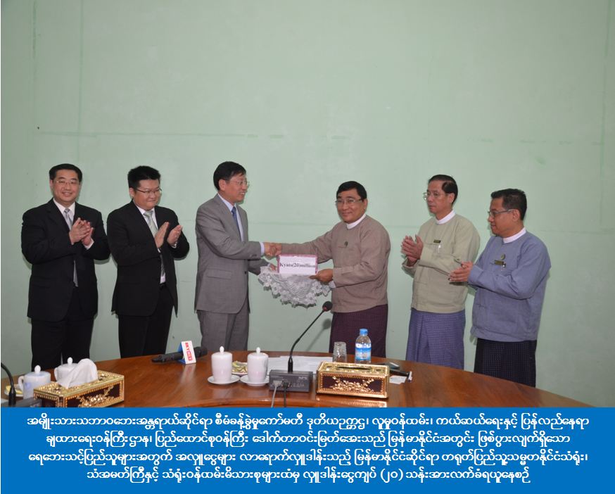 မြန်မာနိုင်ငံအတွင်း ဖြစ်ပွားလျက်ရှိသော ရေဘေးသင့်ပြည်သူများအတွက် မြန်မာနိုင်ငံဆိုင်ရာ တရုတ်ပြည်သူ့သမ္မတနိုင်ငံသံရုံး၊ သံအမတ်ကြီးနှင့်သံရုံးဝန်ထမ်းမိသားစုများက လှူဒါန်းငွေကျပ် (၂၀) သန်းအားသံအမတ်ကြီး Mr.Hong Liang ကလည်းကောင်း၊ State Power Investment Corporation က လှူဒါန်းငွေကျပ် (၁၀) သန်းနှင့် Huawei Myanmar ကလှူဒါန်းငွေကျပ် (၁၀) သန်းအား တာဝန်ရှိသူများကလည်းကောင်း ယနေ့နံနက်ပိုင်းတွင် နေပြည်တော်ရှိ ဝန်ကြီးရုံး အစည်းအဝေးခန်းမ၌ လာရောက်လှူဒါန်းရာ အမျိုးသားသဘာဝဘေးအန္တရာယ်ဆိုင်ရာ စီမံခန့်ခွဲမှုကော်မတီ ဒုတိယဉက္ကဌ၊ လူမှုဝန်ထမ်း၊ ကယ်ဆယ်ရေးနှင့်ပြန်လည်နေရာချထားရေးဝန်ကြီးဌာန၊ ပြည်ထောင်စုဝန်ကြီး ဒေါက်တာဝင်းမြတ်အေး က လက်ခံရယူပြီး ဂုဏ်ပြုမှတ်တမ်းလွှာများ ပြန်လည်ပေးအပ်ခဲ့ပါသည်။