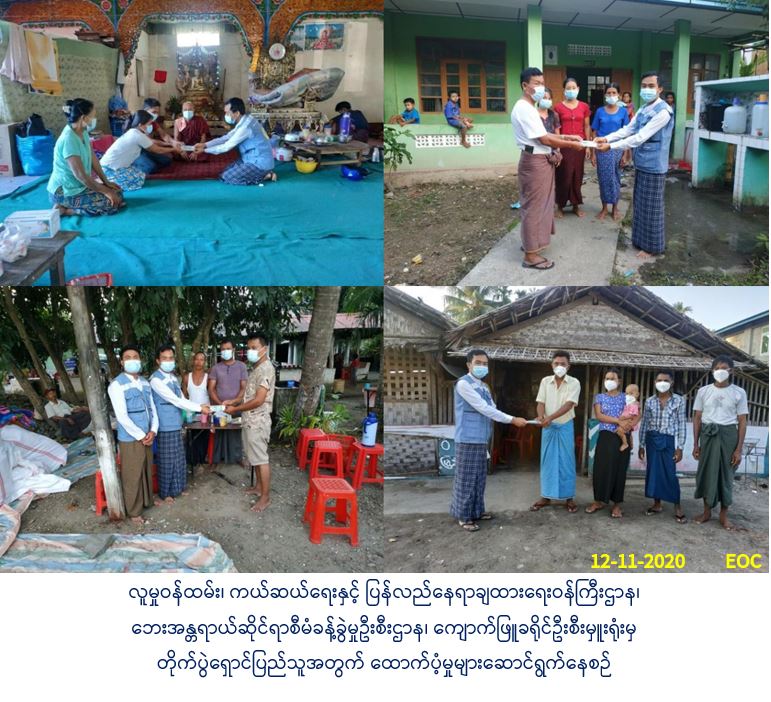 လူမှုဝန်ထမ်း၊ ကယ်ဆယ်ရေးနှင့် ပြန်လည်နေရာချထားရေးဝန်ကြီးဌာန၊ ဘေးအန္တရာယ်ဆိုင်ရာစီမံခန့်ခွဲမှုဦးစီးဌာန၊ ကျောက်ဖြူခရိုင်ဦးစီးမှူးရုံးမှ တာဝန်ရှိသူများသည် ကျောက်ဖြူမြို့နယ်အတွင်း တိုက်ပွဲရှောင်စုရပ်(၇)ခုတွင် ရောက်ရှိ ခိုလှုံလျက်ရှိသော အိမ်ထောင်စု(၁၉၇)စု၊ လူဦးရေ(၆၀၇)ဦးတို့အတွက် ဆန်ရိက္ခာ(၂)ပတ်စာဖိုး ထောက်ပံငွေ(၂၅၄၉၄၀၀/-)ကျပ် အား (၁၁-၁၁-၂၀၂၀) ရက်နေ့တွင်လည်းကောင်း၊ ချောင်းဝကျေးရွာအုပ်စု၊ ကုလားဘာကျေးရွာစာသင်ကျောင်းတွင် ရောက်ရှိ ခိုလှုံလျက်ရှိသော တိုက်ပွဲရှောင်အိမ်ထောင်စု(၃၈)စု၊ လူဦးရေ(၁၀၈)ဦးတို့အတွက် ဆန်ရိက္ခာ(၂)ပတ်စာဖိုးထောက်ပံ့ငွေ (၄၅၃၆၀၀/-)ကျပ်အား (၁၂-၁၁-၂၀၂၀)ရက်နေ့တွင် တိုက်ပွဲရှောင်ပြည်သူများထံ လက်ဝယ်အရောက် ထောက်ပံ့ပေးအပ် ခဲ့ပါကြောင်း သတင်းရရှိပါသည်။