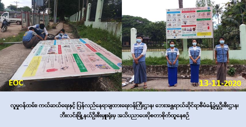 လူမှုဝန်ထမ်း၊ ကယ်ဆယ်ရေးနှင့် ပြန်လည်နေရာချထားရေးဝန်ကြီးဌာန၊ ဘေးအန္တရာယ်ဆိုင်ရာ စီမံခန့်ခွဲမှုဦးစီးဌာန၊ မွန်ပြည်နယ်၊ သထုံခရိုင်၊ ဘီးလင်းမြို့နယ်ဦးစီးမှူးရုံးမှ တာဝန်ရှိသူများသည် (၁၃-၁၁-၂၀၂၀) ရက်နေ့တွင် ဘီးလင်းမြို့နယ်၊ ဘိုးရာဇာရပ်ကွက်၊ မြို့ပတ်လမ်း အ.ထ.က(၁) ကျောင်းရှေ့တွင် စိုက်ထူထားသော မုန်တိုင်းဘေး၊ အသိပညာပေးဗီနိုင်းပိုစတာနေရာတွင် မီးဘေးအသိပညာပေးဗီနိုင်းပိုစတာအား လဲလှယ်စိုက်ထူခဲ့ကြောင်း သတင်းရရှိပါသည်။