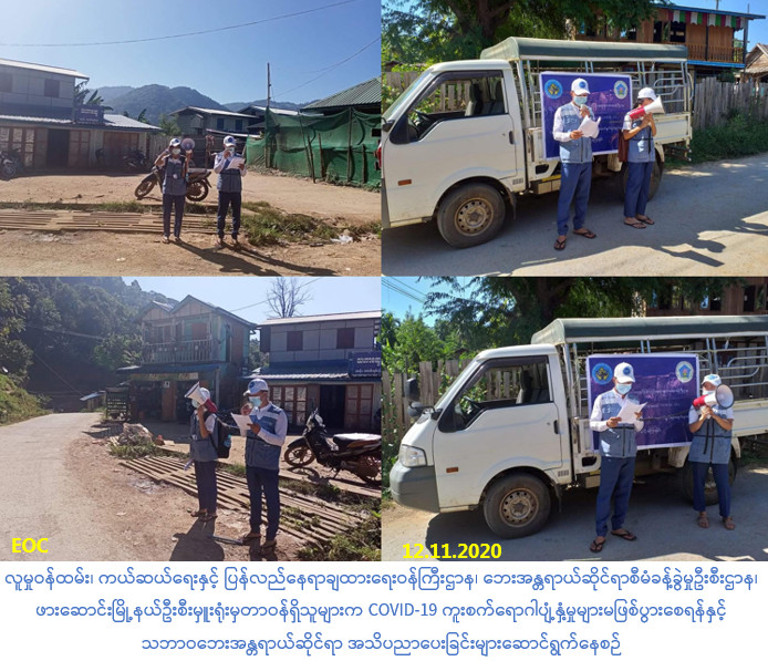 လူမှုဝန်ထမ်း၊ ကယ်ဆယ်ရေးနှင့် ပြန်လည်နေရာချထားရေးဝန်ကြီးဌာန၊ ဘေးအန္တရာယ်ဆိုင်ရာစီမံခန့်ခွဲမှုဦးစီးဌာန၊ ဖားဆောင်းမြို့နယ်ဦးစီးမှူးရုံးမှတာဝန်ရှိသူများသည် (၁၂-၁၁-၂၀၂၀) ရက်နေ့တွင် ဖားဆောင်းမြို့နယ်၊ မော်ချီးကျေးရွာအုပ်စု၊ အနာဂတ်အလင်းတန်းကျေးရွာ၊ ရေပူကျေးရွာ၊ မော်ချီးအောက်ရွာ၊ ဇီးပင်ကွေ့(ဇီး-၁၆)ကျေးရွာ၊ လိုခါးလိုကျေးရွာ၊ ဘူလော်ဘာ ကျေးရွာ၊ လွယ်ပွာခိုကျေးရွာ၊ မော်ချီးတောင်ပေါ်ကျေးရွာနှင့် လိုခါးလို(ကွက်သစ်)ကျေးရွာများရှိ ပြည်သူများအား COVID-19 ရောဂါကူးစက်ပျံ့နှံ့မှုများ မဖြစ်ပွားစေရန် သိရှိလိုက်နာဆောင်ရွက် ရမည့်အချက်များနှင့် သဘာဝဘေးအန္တရာယ်နှင့်စပ်လျဉ်းသည့် ဆောင်ရန်၊ ဆောင်ရန် အချက်များကို အသိပညာပေးနှိုးဆော်ခဲ့ပါကြောင်း သတင်းရရှိပါသည်။