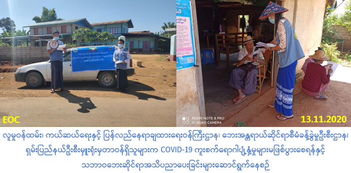 လူမှုဝန်ထမ်း၊ ကယ်ဆယ်ရေးနှင့် ပြန်လည်နေရာချထားရေးဝန်ကြီးဌာန၊ ဘေးအန္တရာယ်ဆိုင်ရာစီမံခန့်ခွဲမှုဦးစီးဌာန၊ ရှမ်းပြည်နယ်ဦးစီးမှူးရုံးမှတာဝန်ရှိသူများသည် (၁၃-၁၁-၂၀၂၀)ရက်နေ့ နံနက်ပိုင်းတွင် ကလောမြို့နယ်၊ နောင်လွယ်ကျေးရွာနှင့် သဲကုန်းကျေးရွာတို့၌ COVID-19 ဒုတိယလှိုင်းကာလအတွင်း ပြည်သူများလိုက်နာရမည့် ကျန်းမာရေးအမူအကျင့်များ အသိပညာပေးခြင်းနှင့် သဘာဝဘေးဆိုင်ရာ အသိပညာပေးခြင်းများကို Hand Speaker အသံချဲ့စက်များဖြင့် လှည့်လည်ဟောပြောခြင်း၊ Mask နှင့် အသိပညာပေးလက်ကမ်းစာစောင်များ ဖြန့်ဝေပေးခြင်း တို့ကို ဆောက်ရွက်ခဲ့ပါကြောင်း သတင်းရရှိပါသည်။