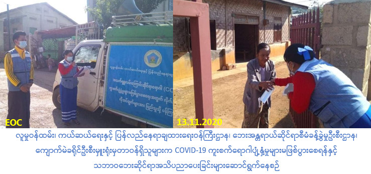 လူမှုဝန်ထမ်း၊ ကယ်ဆယ်ရေးနှင့် ပြန်လည်နေရာချထားရေးဝန်ကြီးဌာန၊ ဘေးအန္တရာယ်ဆိုင်ရာစီမံခန့်ခွဲမှုဦးစီးဌာန၊ ကျောက်မဲခရိုင်ဦးစီးမှူးရုံးမှတာဝန်ရှိသူများသည် (၁၃-၁၁-၂၀၂၀) ရက်နေ့ နံနက် (၀၉း၀၀)အချိန်တွင် ကျောက်မဲမြို့၊ (၈)ရပ်ကွက်အတွင်းရှိ အောင်မင်္ဂလာရပ်ကွက်၊ ရွှေစေတီရပ်၊ ကုန်းမုန်ရပ်၊ မုန်လာခြံရပ်၊ ပန်ဟတ်ကျေးရွာတို့တွင် COVID-19 ဒုတိယလှိုင်း ကာလအတွင်း ပြည်သူများလိုက်နာရမည့် ကျန်းမာရေးအမူအကျင့်များ အသိပညာပေးခြင်းနှင့် သဘာဝဘေးဆိုင်ရာအသိပညာပေးခြင်းများကို Hand Speaker အသံချဲ့စက်များဖြင့် လှည့်လည်ဟောပြောခြင်း၊ Mask များဖြန့်ဝေပေးခြင်းတို့အား ဆောင်ရွက်ခဲ့ပါကြောင်း သတင်းရရှိပါသည်။