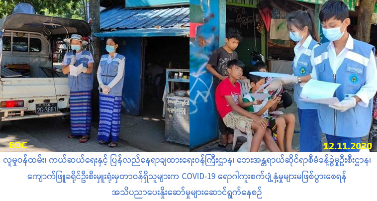 လူမှုဝန်ထမ်း၊ ကယ်ဆယ်ရေးနှင့် ပြန်လည်နေရာချထားရေးဝန်ကြီးဌာန၊ ဘေးအန္တရာယ်ဆိုင်ရာစီမံခန့်ခွဲမှုဦးစီးဌာန၊ ကျောက်ဖြူခရိုင်ဦးစီးမှူးရုံးမှတာဝန်ရှိသူများသည် (၁၂-၁၁-၂၀၂၀)ရက်နေ့၊ နေ့လယ် (၁၂:၃၀) နာရီအချိန်မှ (၁၃:၃၀)နာရီအချိန်အထိ ကျောက်ဖြူမြို့၊ ပြင်ဖြူမော်ရပ်ကွက်၌ COVID-19 အသက်ရှုလမ်းကြောင်းဆိုင်ရာရောဂါနှင့်စပ်လျဉ်း၍ ပြည်သူများသိရှိလိုက်နာနိုင်ရေးအတွက် ဆောင်ရန် ရှောင်ရန် အချက်များအား အသိပညာပေးနှိုးဆော်ခဲ့ပြီး လက်ကမ်းစာစောင်များကိုလည်း ဖြန့်ဝေပေးခဲ့ပါကြောင်း သတင်းရရှိပါသည်။