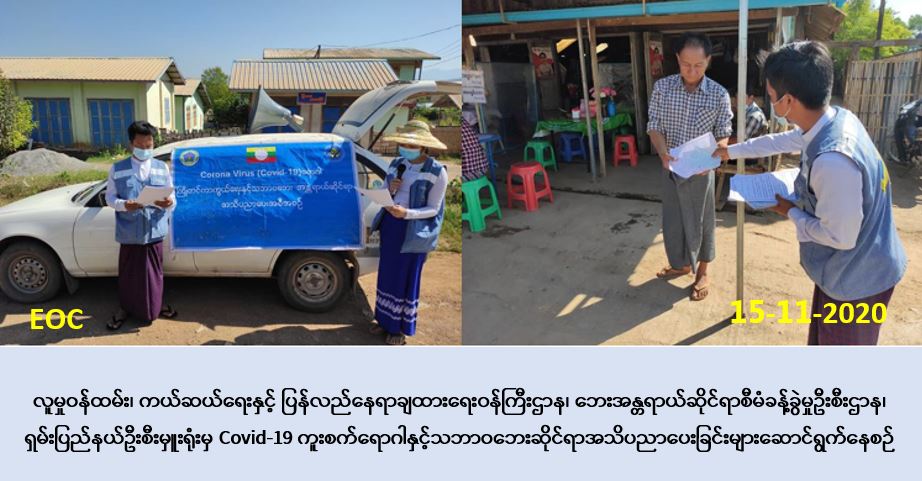 လူမှုဝန်ထမ်း၊ ကယ်ဆယ်ရေးနှင့်ပြန်လည်နေရာချထားရေးဝန်ကြီးဌာန၊ ဘေးအန္တရာယ်ဆိုင်ရာ စီမံခန့်ခွဲမှုဦးစီးဌာန၊ ရှမ်းပြည်နယ်ဦးစီးမှူးရုံးမှ တာဝန်ရှိသူများသည် (၁၅-၁၁-၂၀၂၀)ရက်နေ့၊ ညနေပိုင်းတွင် တောင်ကြီးမြို့နယ်၊ ဆင်တဲကျေးရွာနှင့် ရေပူကျေးရွာတို့၌ COVID-19 ဒုတိယ လှိုင်းကာလအတွင်း ပြည်သူများ လိုက်နာရမည့်ကျန်းမာရေးအမူအကျင့်များ အသိပညာပေးခြင်း နှင့် သဘာဝဘေးဆိုင်ရာ အသိပညာပေးခြင်းများကို Hand Speaker အသံချဲ့စက်များဖြင့် လှည့်လည်ဟောပြောခြင်း ၊ Mask နှင့် အသိပညာပေးလက်ကမ်းစာစောင်များ ဖြန့်ပေးဝေခြင်းတို့အား ဆောင်ရွက်ခဲ့ပါကြောင်း သတင်းရရှိပါသည်။