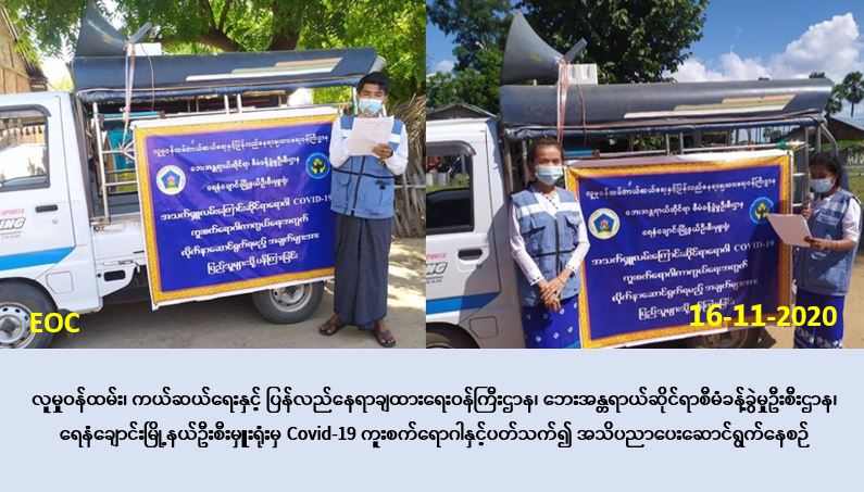 လူမှုဝန်ထမ်း၊ ကယ်ဆယ်ရေးနှင့်ပြန်လည်နေရာချထားရေးဝန်ကြီးဌာန၊ ဘေးအန္တရာယ်ဆိုင်ရာ စီမံခန့်ခွဲမှုဦးစီးဌာန၊ ရေနံချောင်းမြို့နယ်ဦးစီးမှူးရုံးမှ တာဝန်ရှိသူများသည် (၁၆-၁၁-၂၀၂၀) ရက်နေ့၊ နံနက်ပိုင်းတွင် ရေနံချောင်းမြို့နယ်၊ (ဘူးကျွန်းအရှေ့ကျေးရွာ၊ ဝဂ္ဂေါင်းကျေးရွာ၊ ဆားတိုင်ကျေးရွာ) တို့တွင် လှည့်လည်၍ Covid-19 ကူးစက်ရောဂါနှင့် ပတ်သက်ပြီး ဆောင်ရန်/ရှောင်ရန်များအား အသိပညာပေးခြင်း ဆောင်ရွက်ခဲ့ကြောင်း သတင်းရရှိပါသည်။