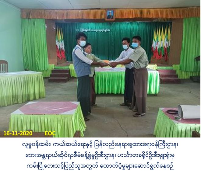 လူမှုဝန်ထမ်း၊ ကယ်ဆယ်ရေးနှင့် ပြန်လည်နေရာချထားရေးဝန်ကြီးဌာန၊ ဘေးအန္တရာယ်ဆိုင်ရာစီမံခန့်ခွဲမှုဦးစီးဌာန၊ ဟင်္သာတခရိုင်ဦးစီးမှူးရုံးမှ တာဝန်ရှိသူများသည် (၁၁-၁၁-၂၀၂၀) ရက်နေ့၌ လေးမျက်နှာမြို့နယ်၊ မဲဇလီကျေးရွာအုပ်စု၊ မဲဇလီကျေးရွာတွင် ဖြစ်ပွားခဲ့သော ကမ်းပြိုဘေးကြောင့် ပျက်စီးအိမ်ခြေ (၂)လုံး၊ အိမ်ထောင်စု(၂)စုအတွက် အိမ်ဆောက်ပစ္စည်းဖိုးထောက်ပံ့ငွေ (၂၀၀၀၀၀/-)ကျပ်၊ လူဦးရေ(၁၀)ဦးအတွက် ဆန်ရိက္ခာ(၇)ရက်စာဖိုးထောက်ပံ့ငွေ (၂၁၀၀၀ိ/-) ကျပ်၊ စုစုပေါင်းထောက်ပံ့ငွေ (၂၂၁၀၀၀/-)ကျပ်အား (၁၆-၁၁-၂၀၂၀)ရက်နေ့ (၁၃:၃၀) နာရီအချိန်တွင် သက်ဆိုင်ရာ တာဝန်ရှိသူများနှင့်အတူ လေးမျက်နှာမြို့နယ်၊ အထွေထွေအုပ်ချုပ်ရေးဦးစီးဌာန၌ ဘေးသင့်ပြည်သူများ လက်ဝယ် သို့အရောက် ထောက်ပံ့ပေးအပ်ခဲ့ပါကြောင်း သတင်းရရှိပါသည်။