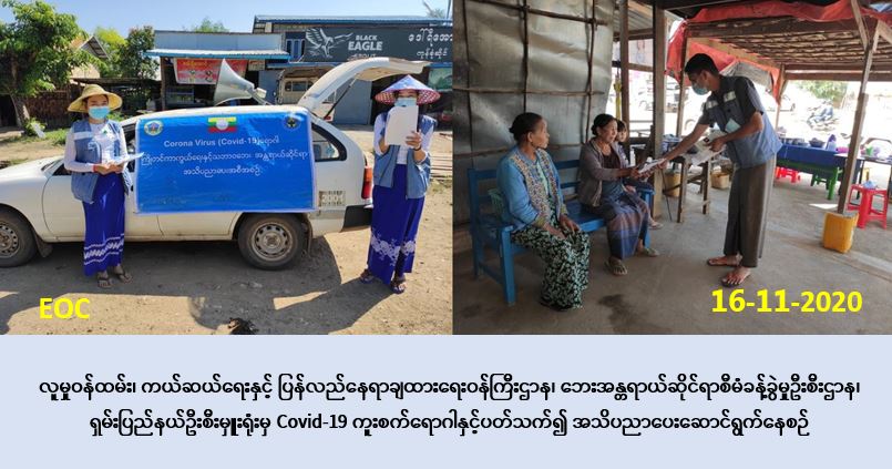 လူမှုဝန်ထမ်း၊ ကယ်ဆယ်ရေးနှင့်ပြန်လည်နေရာချထားရေးဝန်ကြီးဌာန၊ ဘေးအန္တရာယ်ဆိုင်ရာ စီမံခန့်ခွဲမှုဦးစီးဌာန၊ ရှမ်းပြည်နယ်ဦးစီးမှူးရုံးမှ တာဝန်ရှိသူများသည်(၁၆-၁၁-၂၀၂၀)ရက်နေ့၊ နေ့လယ်ပိုင်းတွင် တောင်ကြီးမြို့နယ်၊ အောင်သုခကျေးရွာနှင့် လူရိုးတောင်ကျေးရွာတို့၌ COVID-19 ဒုတိယလှိုင်းကာလအတွင်း ပြည်သူများ လိုက်နာရမည့်ကျန်းမာရေးအမူအကျင့်များ အသိပညာပေးခြင်းနှင့် သဘာဝဘေးဆိုင်ရာ အသိပညာပေးခြင်းများကို Hand Speaker အသံချဲ့စက်များဖြင့် လှည့်လည်ဟောပြောခြင်း ၊ Mask နှင့် အသိပညာပေးလက်ကမ်းစာစောင်များ ဖြန့်ပေးဝေခြင်းတို့အား ဆောင်ရွက်ခဲ့ပါကြောင်း သတင်းရရှိပါသည်။
