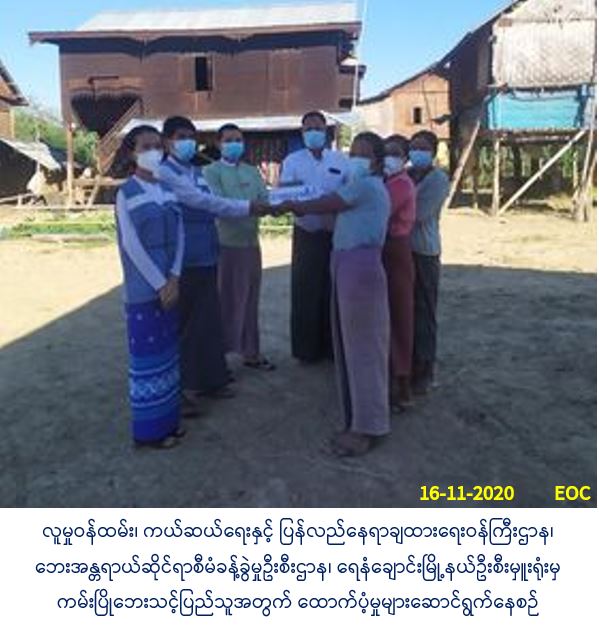 လူမှုဝန်ထမ်း၊ ကယ်ဆယ်ရေးနှင့် ပြန်လည်နေရာချထားရေးဝန်ကြီးဌာန၊ ဘေးအန္တရာယ်ဆိုင်ရာစီမံခန့်ခွဲမှုဦးစီးဌာန၊ ရေနံချောင်းမြို့နယ်ဦးစီးမှူးရုံးမှ တာဝန်ရှိသူများသည် (၁၂-၁၁-၂၀၂၀) ရက်နေ့၌ မကွေးတိုင်းဒေသကြီး၊ ရေနံချောင်းမြို့နယ်၊ ကျမ်းကိုင်ကျွန်းကျေးရွာအုပ်စု၊ ကံသာကျေးရွာတွင် ဧရာဝတီမြစ်ရေတိုက်စားမှုကြောင့် ကမ်းပြိုဘေးသင့် နေအိမ်(၁၁)လုံး အတွက် အိမ်ဆောက်ပစ္စည်းဖိုးထောက်ပံ့ငွေ (၁,၁၀၀,၀၀၀/-)ကျပ်၊ လူဦးရေ(၄၃)ဦးအတွက် ဆန်ရိက္ခာ(၇)ရက်စာဖိုး ထောက်ပံ့ငွေ (၉၀၃၀၀/-) ကျပ်၊ စုစုပေါင်းထောက်ပံ့ငွေ (၁,၁၉၀,၃၀၀/-)ကျပ်အား (၁၆-၁၁-၂၀၂၀) ရက်နေ့ (၁၅:၃၀)အချိန်တွင် အထွေထွေအုပ်ချုပ်ရေးဦးစီးဌာနမှ တာဝန်ရှိသူများနှင့်အတူ ကျေးရွာတာဝန်ရှိသူများထံ ကွင်းဆင်းထောက်ပံ့ပေးအပ်ခဲ့ပါ ကြောင်း သတင်းရရှိပါသည်။