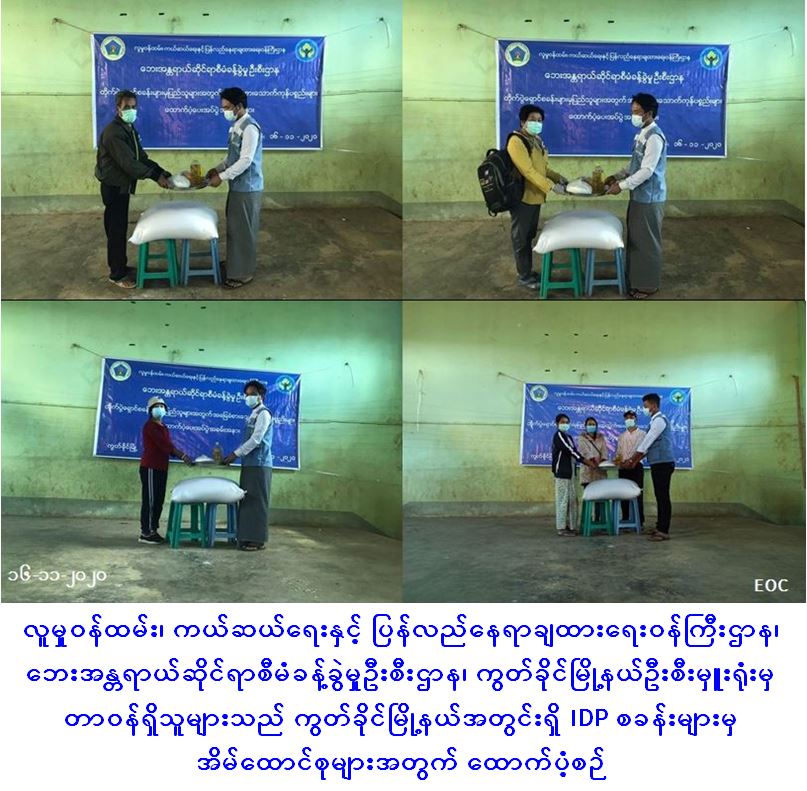 လူမှုဝန်ထမ်း၊ ကယ်ဆယ်ရေးနှင့် ပြန်လည်နေရာချထားရေးဝန်ကြီးဌာန၊ ဘေးအန္တရာယ်ဆိုင်ရာစီမံခန့်ခွဲမှုဦးစီးဌာန၊ ကွတ်ခိုင်မြို့နယ်ဦးစီးမှူးရုံးမှ တာဝန်ရှိသူများသည် (၁၆-၁၁-၂၀၂၀) ရက်နေ့တွင် ကွတ်ခိုင်မြို့နယ်အတွင်းရှိ IDP စခန်း (၁၄) ခုမှ တိုက်ပွဲရှောင် အိမ်ထောင်စု (၈၅၅)စု၊ လူဦးရေ (၄၅၉၃)ဦးအတွက် အခြေခံ စားသောက်ကုန်ပစ္စည်းများဖြစ်သည့် ဆန်(၆၇၀)အိတ်၊ ဆီ(၈၅၅)ပိဿာ၊ ဆား(၄၄၃)ပိဿာ၊ ကုလားပဲ(၈၅၅)ပိဿာ (၁၄)ရက်စာအား ကွင်းဆင်းထောက်ပံ့ရေးဆောင်ရွက်ခဲ့ကြောင်း သတင်းရရှိပါသည်။
