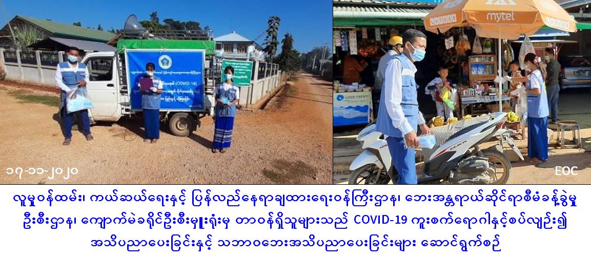 လူမှုဝန်ထမ်း၊ ကယ်ဆယ်ရေးနှင့် ပြန်လည်နေရာချထားရေးဝန်ကြီးဌာန၊ ဘေးအန္တရာယ်ဆိုင်ရာစီမံခန့်ခွဲမှုဦးစီးဌာန၊ ကျောက်မဲခရိုင်ဦးစီးမှူးရုံးမှ တာဝန်ရှိသူများသည် (၁၇-၁၁-၂၀၂၀) ရက်နေ့၊ (၀၈:၀၀) နာရီအချိန်တွင် ကျောက်မဲမြို့နယ်၊ ဟဲပုကျေးရွာ၊ ချောင်းဆာကျေးရွာ၊ မန်ဝိန်းကျေးရွာများအတွင်း COVID-19 ဒုတိယလှိုင်းကာလအတွင်း ပြည်သူများ လိုက်နာရမည့်ကျန်းမာရေးအမူအကျင့်များ အသိပညာပေးခြင်းနှင့် သဘာဝဘေးဆိုင်ရာ အသိပညာပေးခြင်းများကို Hand Speaker အသံချဲ့စက်များဖြင့် လှည့်လည်ဟောပြောခြင်း၊ Mask များ ဖြန့်ဝေပေးခြင်းတို့အား ဆောင်ရွက်ခဲ့ကြောင်း သတင်းရရှိပါသည်။