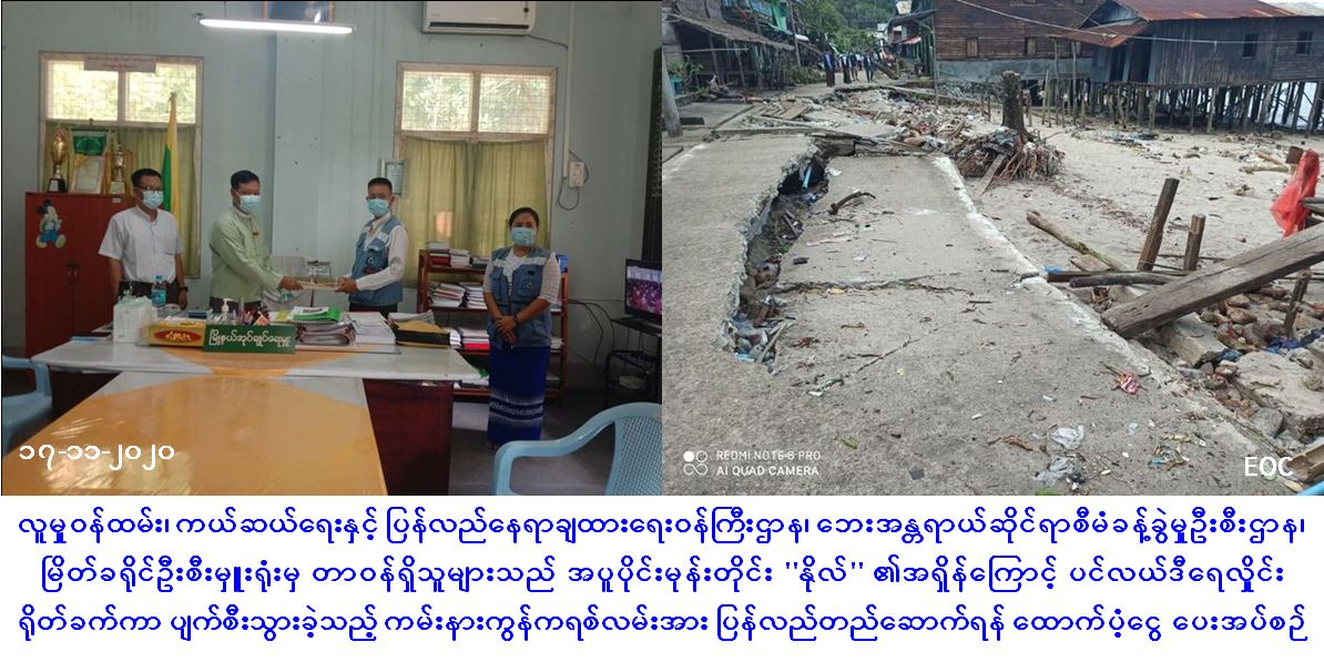 လူမှုဝန်ထမ်း၊ ကယ်ဆယ်ရေးနှင့် ပြန်လည်နေရာချထားရေးဝန်ကြီးဌာန၊ ဘေးအန္တရာယ်ဆိုင်ရာစီမံခန့်ခွဲမှုဦးစီးဌာန၊ မြိတ်ခရိုင်ဦးစီးမှူးရုံးမှ တာဝန်ရှိသူများသည် (၁၈-၉-၂၀၂၀) ရက်နေ့မှ (၂၀-၉-၂၀၂၀) ရက်နေ့အတွင်း အပူပိုင်းမုန်းတိုင်း ”နိုလ်” ၏အရှိန်ကြောင့် ပင်လယ်ဒီရေလှိုင်းရိုတ်ခက်ကာ ပျက်စီးသွားခဲ့သည့် ကျွန်းစုမြို့နယ်၊ စခန်းသစ်ကျေးရွာအုပ်စု၊ စခန်းသစ်ကျေးရွာရှိ ကမ်းနားကွန်ကရစ်လမ်းအား ပြန်လည်တည်ဆောက်ရန် စုစုပေါင်းထောက်ပံ့ငွေ (၃၃,၆၀၀,၀၀၀/-)ကျပ်အား (၁၇-၁၁-၂၀၂၀) ရက်နေ့၊ (၁၀:၃၀) နာရီအချိန်တွင် ကျွန်းစုမြို့နယ် သဘာဝဘေးစီမံခန့်ခွဲမှုအဖွဲ့ ဥက္ကဌ၊ အထွေထွေအုပ်ချုပ်ရေးဦးစီးဌာနသို့ သွားရောက်လွှဲပြောင်းထောက်ပံ့ပေးခဲ့ကြောင်း သတင်းရရှိပါသည်။