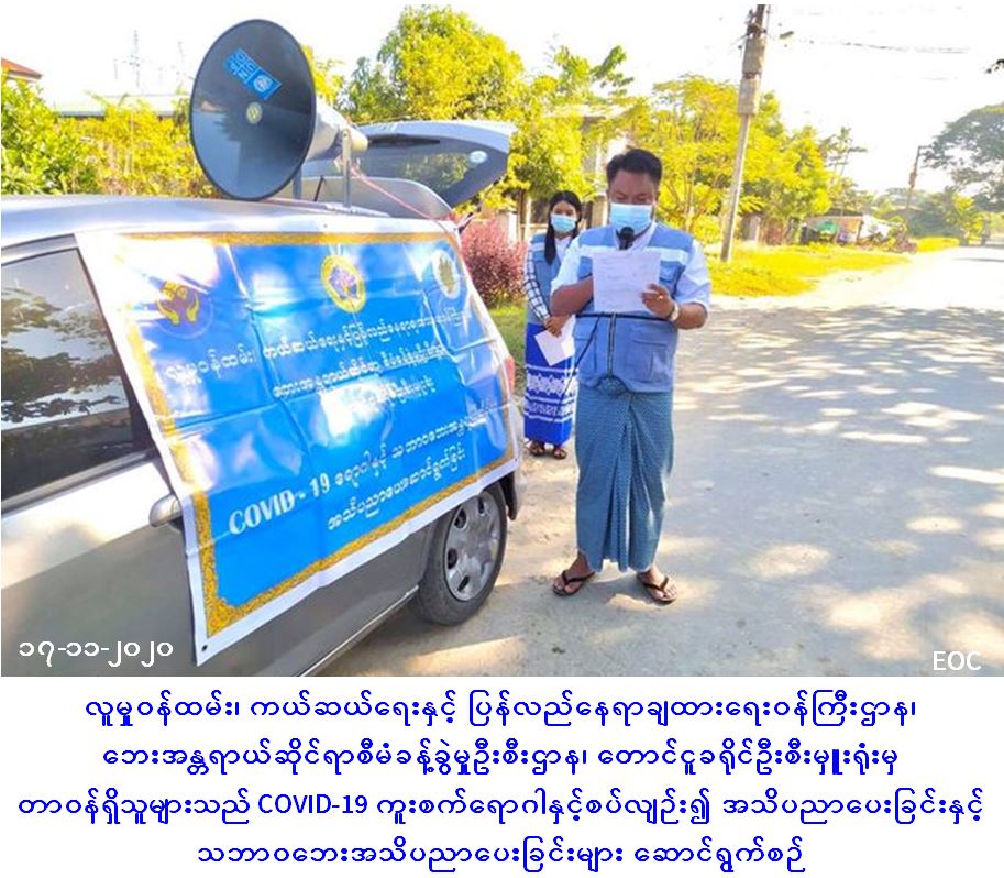 လူမှုဝန်ထမ်း၊ ကယ်ဆယ်ရေးနှင့် ပြန်လည်နေရာချထားရေးဝန်ကြီးဌာန၊ ဘေးအန္တရာယ်ဆိုင်ရာစီမံခန့်ခွဲမှုဦးစီးဌာန၊ တောင်ငူခရိုင်ဦးစီးမှူးရုံးမှ တာဝန်ရှိသူများသည် (၁၇-၁၁-၂၀၂၀) ရက်နေ့တွင် တောင်ငူခရိုင်၊ တောင်ငူမြို့နယ်၊ ကျွန်းကုန်းကျေးရွာအုပ်စု၊ ကျွန်းကုန်းမြောက်ပိုင်း၊ ကျွန်းကုန်းတောင်ပိုင်း၊ ကျွန်းကုန်းစျေးပိုင်း၊ ကျွန်းကုန်းအနောက်ပိုင်းနှင့် ဥသျှစ်ကုန်းကျေးရွာများအတွင်း COVID-19 ရောဂါ ကူးစက်ပြန့်ပွားမှု ထပ်မံမဖြစ်ပွားစေရေးအတွက် ဆောင်ရန်/ ရှောင်ရန်အချက်များအားလည်းကောင်း၊ သဘာဝဘေးအန္တရာယ်များနှင့်ပတ်သက်၍ ဆောင်ရန်၊ ရှောင်ရန်အချက်များအားလည်းကောင်း အသိပညာပေး ဆော်ဩခဲ့ကြောင်း သတင်းရရှိပါသည်။