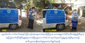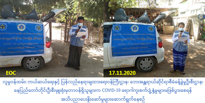 လူမှုဝန်ထမ်း၊ ကယ်ဆယ်ရေးနှင့် ပြန်လည်နေရာချထားရေးဝန်ကြီးဌာန၊ ဘေးအန္တရာယ်ဆိုင်ရာစီမံခန့်ခွဲမှုဦးစီးဌာန၊ ပြည်ထောင်စုနယ်မြေ၊ နေပြည်တော်တိုင်းဦးစီးမှူးရုံးမှတာဝန်ရှိသူများသည် (၁၇-၁၁-၂၀၂၀) ရက်နေ့၊ နံနက်(၀၉:၃၀) အချိန်မှ (၁၅:၃၀)အချိန်အထိ COVID-19 ရောဂါ ကူးစက်ပျံ့နှံ့မှုများ မဖြစ်ပွားစေရေးအတွက် ပြည်သူများသိရှိလိုက်နာဆောင်ရွက်ရမည့်အချက် များကို ပုဗ္ဗသီရိမြို့နယ်၊ ဖြုတ်ခွဲကျေးရွာ၊ ဖြုတ်ကုန်းကျေးရွာ၊ လယ်သာကျေးရွာ၊ အင်ဂျင်းစု ကျေးရွာ၊ ထုံးဘိုကျေးရွာနှင့် ကျည်တောင်ကန်ကျေးရွာ အမှတ်(၁၊ ၂၊ ၃၊ ၄၊ ၅၊ ၆) ရပ်ကွက်များရှိ ပြည်သူများအား ထိရောက်စွာ အသိပညာပေးနှိုးဆော်ခဲ့ပါကြောင်း သတင်းရရှိပါသည်။