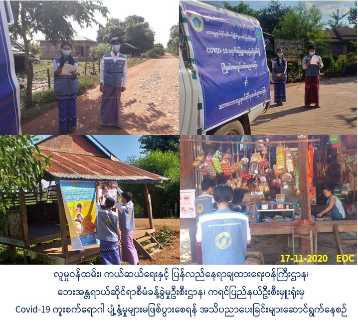 လူမှုဝန်ထမ်း၊ ကယ်ဆယ်ရေးနှင့် ပြန်လည်နေရာချထားရေးဝန်ကြီးဌာန၊ ဘေးအန္တရာယ်ဆိုင်ရာစီမံခန့်ခွဲမှုဦးစီးဌာန၊ ကရင်ပြည်နယ်ဦးစီးမှူးရုံးမှ တာဝန်ရှိသူများသည် (၁၇-၁၁-၂၀၂၀) ရက်နေ့၊ (၁၁:၀၀) အချိန်မှ (၁၅:၃၀) အချိန်အထိ ဘားအံမြို့နယ်၊ ခြံကလေးကျေးရွာ၊ ရွှေပြည်အေးကျေးရွာ၊ တောကြီးကျေးရွာ၊ ညောင်ကုန်းကျေးရွာ၊ ကော့ကလွေကျေးရွာ၊ ကရင်ကော့ကျိုက်ကျေးရွာများရှိ ပြည်သူများအား COVID-19 ကူးစက်မြန်ရောဂါ ပြန့်ပွားမှုများမဖြစ်ပွားစေရန်အတွက် သိရှိလိုက်နာရမည့် အချက်များအား လော်စပီကာဖြင့် အသိပညာပေးဆောင်ရွက်ခဲ့ပြီး Maskနှင့် လက်ကမ်းစာစောင်များလည်း ဖြန့်ဝေပေးခဲ့ပါကြောင်း သတင်းရရှိပါသည်။