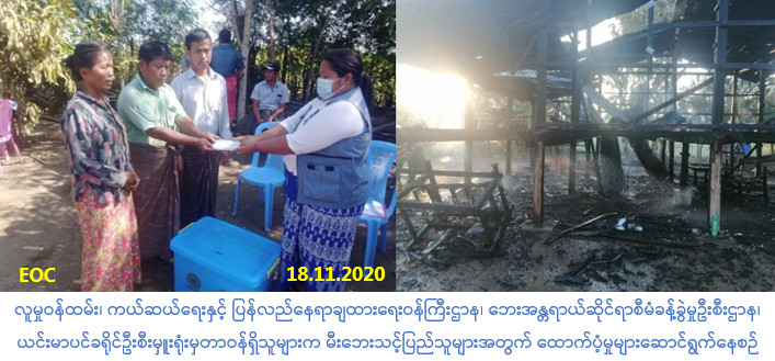လူမှုဝန်ထမ်း၊ ကယ်ဆယ်ရေးနှင့် ပြန်လည်နေရာချထားရေးဝန်ကြီးဌာန၊ ဘေးအန္တရာယ်ဆိုင်ရာစီမံခန့်ခွဲမှုဦးစီးဌာန၊ ယင်းမာပင်ခရိုင်ဦးစီးမှူးရုံးမှတာဝန်ရှိသူများသည် စစ်ကိုင်းတိုင်းဒေသကြီး၊ ယင်းမာပင်ခရိုင်၊ ပုလဲမြို့နယ်၊ လက်ပုကန်ကျေးရွာအုပ်စု၊ ကုက္ကိုကုန်းကျေးရွာ၌ (၁၇-၁၁-၂၀၂၀) ရက်နေ့တွင် လူနေအိမ်တစ်လုံး မီးလောင်မှုဖြစ်ပွားခဲ့သောကြောင့် ဘေးသင့်အိမ်ထောင်စု(၁)စုမှ လူဦးရေ(၄)ဦးအတွက် ဆန်ရိက္ခာဖိုးထောက်ပံ့ငွေ(၈,၄၀၀/-)ကျပ်၊ အိမ်ဆောက်ပစ္စည်းဖိုးထောက် ပံ့ငွေ(၁၀၀,၀၀၀/-)ကျပ်၊ ကယ်ဆယ်ရေးပစ္စည်း (၁၇)မျိုး(၁)အိမ်ထောင်စာနှင့် mask(၈)ခုအား (၁၈-၁၁-၂၀၂၀)ရက်နေ့တွင် ထောက်ပံ့ပေးအပ်ခဲ့ပါကြောင်း သတင်းရရှိပါသည်။