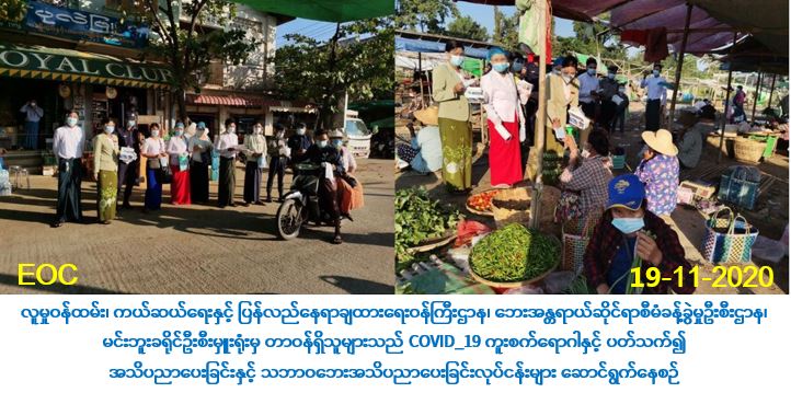 လူမှုဝန်ထမ်း၊ ကယ်ဆယ်ရေးနှင့် ပြန်လည်နေရာချထားရေးဝန်ကြီးဌာန၊ ဘေးအန္တရာယ် ဆိုင်ရာစီမံခန့်ခွဲမှုဦးစီးဌာန၊ မင်းဘူးခရိုင်ဦးစီးမှူးရုံးမှ တာဝန်ရှိသူများသည် (၁၉-၁၁-၂၀၂၀) ရက်နေ့၊ (၀၇:၀၀) နာရီအချိန်မှ (၀၈:၃၀) နာရီအချိန်ထိ မင်းဘူးမြို့၊ ယာယီဈေးနှင့် မြို့မဈေး တို့၌ အသက်ရှူလမ်းကြောင်းဆိုင်ရာရောဂါ Coronavirus Disease Covid-19 ကာကွယ်၊ လျော့ပါးရေးအတွက် ဌာနဆိုင်ရာများနှင့်ပူးပေါင်း၍ Mask များဝေငှပေးခြင်းနှင့် အသိပညာပေးလက်ကမ်း စာစောင်များအား ပြည်သူများသို့ ဝေငှခြင်းများ ပြုလုပ်ဆောင်ရွက်ခဲ့ကြောင်း သတင်းရရှိပါသည်။