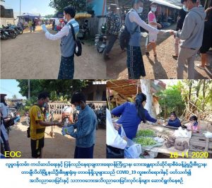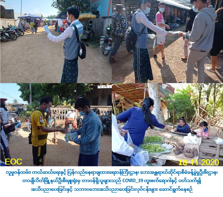 လူမှုဝန်ထမ်း၊ ကယ်ဆယ်ရေးနှင့် ပြန်လည်နေရာချထားရေးဝန်ကြီးဌာန၊ ဘေးအန္တရာယ် ဆိုင်ရာစီမံခန့်ခွဲမှုဦးစီးဌာန၊ တာချီလိတ်မြို့နယ်ဦးစီးမှူးရုံးမှ တာဝန်ရှိသူများသည် (၁၈-၁၁-၂၀၂၀) ရက်နေ့၊ နံနက်ပိုင်းတွင် (COVID-19) ရောဂါကူးစက်မှု ဒေသတွင်း မဖြစ်ပွားစေရေး အတွက် ပါခုတ်တိုက်ကျေးရွာနှင့် ပါခုတ်နို့ကျေးရွာတို့တွင်လည်းကောင်း၊ နေ့လည်ပိုင်းတွင် ဆွတ်ဆိုင်ကျေးရွာနှင့် နမ့်လုတ်ကျေးရွာတို့တွင် (COVID-19) ကူးစက်ရောဂါကြိုတင် ကာကွယ်ရေးနည်းလမ်းများကိုလည်းကောင်း၊ သဘာဝဘေးနှင့်ပတ်သတ်သည့် ဆောင်ရန်/ ရှောင်ရန်များကိုလည်းကောင်း Hand Speaker များ အသုံးပြုခြင်းဖြင့် အသိပညာပေး ဆော်သြခြင်း၊ hand gelများဖြင့် လက်သန့်စင်စေခြင်း၊ မဖြစ်မနေအပြင်ထွက်ရပါက mask အမြဲတပ်ဆင်သွားကြရန် အသိပေးပြောကြားပြီး mask များဖြန့်ဝေခြင်း၊ လက်သန့်စင် ဆေးကြောရန် ဆပ်ပြာခဲများပေးဝေခြင်း၊ သဘာဝဘေးအသိပညာပေးလက်ကမ်းစာစောင် များဖြန့်ဝေခြင်းနှင့် ဗီနိုင်းပိုစတာများ ကပ်ခြင်းလုပ်ငန်းတို့ကို ပြုလုပ်ဆောင်ရွက်ခဲ့ကြောင်း သတင်းရရှိပါသည်။