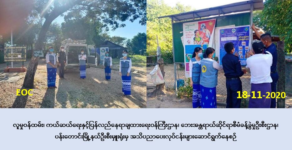 လူမှုဝန်ထမ်း၊ ကယ်ဆယ်ရေးနှင့် ပြန်လည်နေရာချထားရေးဝန်ကြီးဌာန၊ ဘေးအန္တရာယ်ဆိုင်ရာ စီမံခန့်ခွဲမှုဦးစီးဌာန၊ ပန်းတောင်းမြို့နယ်ဦးစီးမှူးရုံးမှ တာဝန်ရှိသူများသည် (၁၈-၁၁-၂၀၂၀) ရက်နေ့၊ နေ့လည်(၁၄း၀၀)အချိန်တွင် ပန်းတောင်းမြို့နယ်၊ ဖန်ခါးပင်ကျေးရွာ၊ တယ်ပင်ကျိုး ကျေးရွာ၊ ကျီးပင်ကန်ကျေးရွာ၊ ဘုရားပေါ်ကျေးရွာနှင့် ငါးဆယ်ပေးကျေးရွာတို့တွင် COVID-19 ရောဂါကူးစက်ပျံ့နှံ့မှုများ မဖြစ်ပွားစေရန်အသိပညာပေးခြင်းနှင့် မီးဘေး၊ လေဘေး ၊ငလျင်ဘေး ဆောင်ရန်၊ ရှောင်ရန်များကို အသံချဲ့စက်ဖြင့်လှည့်လှည်ဟောပြော၍ ဗီနိုင်းပိုစတာများ ကပ်ခြင်းတို့ကို ပြည်ခရိုင်ဦးစီးမှူးရုံးနှင့် ပန်းတောင်းမြို့နယ်မီးသတ်တပ်ဖွဲ့တို့နှင့်အတူ ပူးပေါင်း ဆောင်ရွက်ခဲ့ကြောင်း သတင်းရရှိပါသည်။