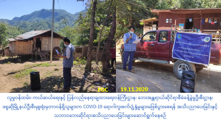 လူမှုဝန်ထမ်း၊ ကယ်ဆယ်ရေးနှင့် ပြန်လည်နေရာချထားရေးဝန်ကြီးဌာန၊ ဘေးအန္တရာယ်ဆိုင်ရာစီမံခန့်ခွဲမှုဦးစီးဌာန၊ ဖရူဆိုမြို့နယ်ဦးစီးမှူးရုံးမှတာဝန်ရှိသူများသည် (၁၉-၁၁-၂၀၂၀)ရက်နေ့တွင် ဖရူဆိုမြို့နယ်၊ ဒိုမိုစောကျေးရွာအုပ်စု၊ ခါးဘယ်ကျေးရွာ၊ ဒိုမိုစောကျေးရွာ၊ ဟိုယာကျေးရွာအုပ်စု၊ ရီကီဘူးကျေးရွာနှင့် ဟူမိုထိကျေးရွာများရှိ ပြည်သူများအား COVID-19 ရောဂါကူးစက်ပြန့်ပွားမှု မဖြစ်ပွားစေရေးအတွက် သိရှိလိုက်နာရမည့်အချက်များနှင့် သဘာဝဘေးနှင့်စပ်လျဉ်းသည့် ဆောင်ရန်/ ရှောင်ရန် အချက်များကို အသိပညာပေးနှိုးဆော်ခဲ့ပါကြောင်း သတင်းရရှိပါသည်။
