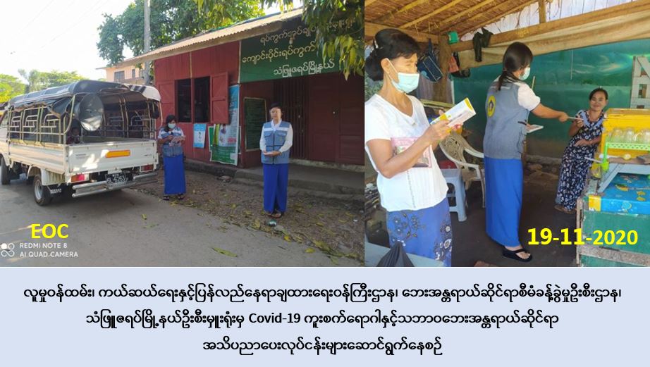 လူမှုဝန်ထမ်း၊ ကယ်ဆယ်ရေးနှင့် ပြန်လည်နေရာချထားရေးဝန်ကြီးဌာန၊ ဘေးအန္တရာယ်ဆိုင်ရာ စီမံခန့်ခွဲမှုဦးစီးဌာန၊ သံဖြူဇရပ်မြို့နယ်ဦးစီးမှူးရုံးမှ တာဝန်ရှိသူများသည် (၁၉-၁၁-၂၀၂၀) ရက်နေ့၊ (၁၃:၀၀)နာရီမှ (၁၄:၃၀)နာရီထိ သံဖြူဇရပ်မြို့နယ်၊ ကျောင်းပိုင်းရပ်ကွက်နှင့် ကြံ့ခိုင် ရေးရပ်ကွက်တို့၌ (Covid-19) အသက်ရှူလမ်းကြောင်းဆိုင်ရာရောဂါနှင့်ပတ်သက်၍ အများ ပြည်သူများ သိရှိလိုက်နာနိုင်ရန် ကျန်းမာရေးနှင့် အားကစားဝန်ကြီးဌာနမှ ထုတ်ပြန်ထားသော အသိပေးကြေညာချက်များနှင့် ဦးစီးဌာနမှထုတ်ပြန်ထားသည့် သဘာဝဘေးအန္တရာယ်ဆိုင်ရာ လက်ကမ်းစာစောင်များပါ ဆောင်ရန်/ရှောင်ရန်များအား အသိပညာပေးခြင်းများကို ဆောင်ရွက် ခဲ့ကြောင်း သတင်းရရှိပါသည်။