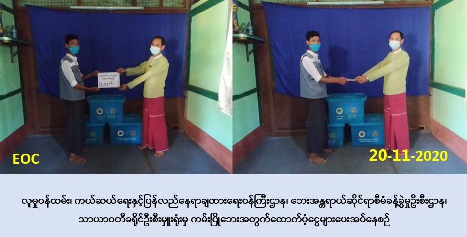 လူမှုဝန်ထမ်း၊ ကယ်ဆယ်ရေးနှင့် ပြန်လည်နေရာချထားရေးဝန်ကြီးဌာန၊ ဘေးအန္တရာယ်ဆိုင်ရာ စီမံခန့်ခွဲမှုဦးစီးဌာန၊ ပဲခူးတိုင်းဒေသကြီး ၊သာယာဝတီခရိုင်ဦးစီးမှူးရုံးမှ တာဝန်ရှိသူများသည် လက်ပံတန်းမြို့နယ်၊ မြင်ကဝကျေးရွာအုပ်စု၊ သလပ်ဖက်ပင်ကုန်းကျေးရွာနှင့် ဂုံညှင်းတန်း ကျေးရွာအုပ်စု၊ ငှက်ပျောတောကျေးရွာတို့၌ (၁၆-၁၁-၂၀၂၀) ရက်နေ့တွင် ဖြစ်ပွားခဲ့သော မြစ်မခမြစ်ရေတိုက်စား၍ ကမ်းပြိုမှုကြောင့် ကြိုတင်ဖျက်သိမ်းပြောင်းရွှေ့ နေအိမ် (၂) လုံး နှင့် မျောပါပျက်စီးနေအိမ် (၁) လုံးတို့အတွက် အိမ်ဆောက်ပစ္စည်းဖိုးထောက်ပံ့ငွေ(၄၀၀,၀၀ဝ/-)ကျပ်၊ အိမ်ထောင်စု (၃) စုရှိလူဦးရေ (၁၄) ဦးတို့အတွက် ဆန်ရိက္ခာ (၇) ရက်စာဖိုး ထောက်ပံ့ ငွေ(၂၉,၄၀ဝ/-)ကျပ်၊ စုစုပေါင်းထောက်ပံ့ငွေ (၄၂၉,၄၀ဝ/-)ကျပ်နှင့် ပြောင်းရွှေ့နေအိမ် (၂) လုံးရှိအိမ်ထောင်စု (၂) စာအတွက် ကယ်ဆယ်ရေးပစ္စည်း (၁၁) မျိုးပါ (၂) အိမ်ထောင် စာ နှင့် မျောပါပျက်စီးနေအိမ်(၁) လုံးအတွက် ကယ်ဆယ်ရေးပစ္စည်း (၁၆) မျိုးပါ (၁) အိမ် ထောင်စာတို့အား (၂၀-၁၁-၂၀၂၀) ရက်နေ့ ၊ (၁၃:၀၀) နာရီအချိန်တွင် လက်ပံတန်းမြို့နယ်အထွေထွေအုပ်ချုပ်ရေးဦးစီးဌာန၌ အထွေထွေအုပ်ချုပ်ရေးဦးစီးဌာနမှ တာဝန်ရှိသူများ၊ သက်ဆိုင်ရာရပ်ကွက်အုပ်ချုပ်ရေးမှူးများ၊ ရပ်ကျေးစာရေးများနှင့်အတူ ဘေးသင့်ပြည်သူများ ထံသို့ လက်ဝယ်အရောက် သွားရောက်ထောက်ပံ့ပေးအပ်ခဲ့ကြောင်း သတင်းရရှိပါသည်။