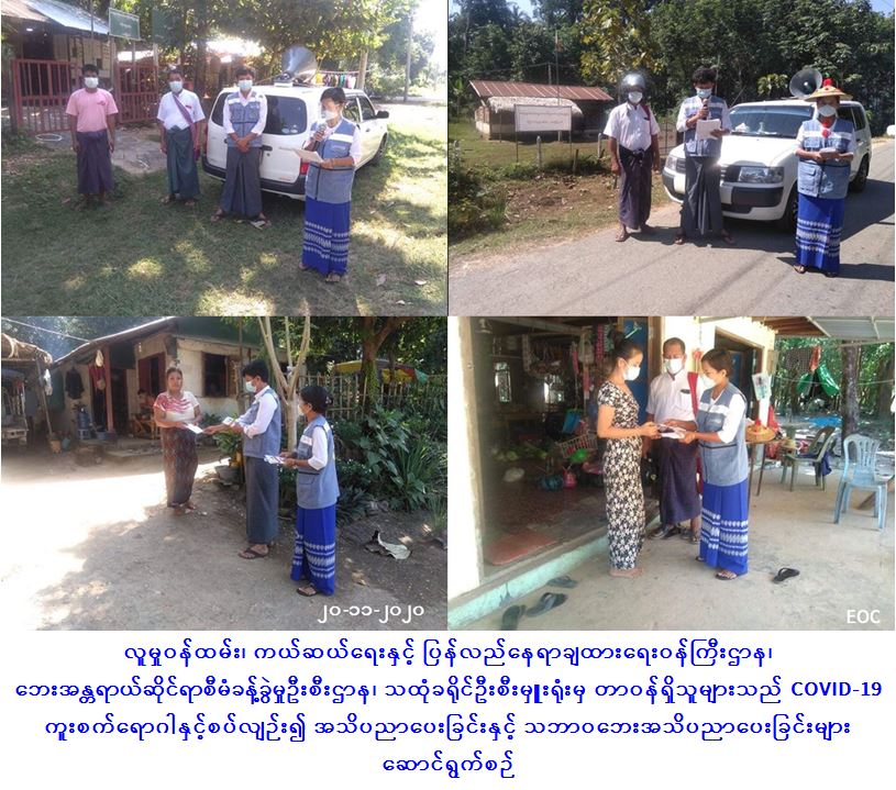 လူမှုဝန်ထမ်း၊ ကယ်ဆယ်ရေးနှင့် ပြန်လည်နေရာချထားရေးဝန်ကြီးဌာန၊ ဘေးအန္တရာယ်ဆိုင်ရာစီမံခန့်ခွဲမှုဦးစီးဌာန၊ သထုံခရိုင်ဦးစီးမှူးရုံးမှ တာဝန်ရှိသူများသည် (၂၀-၁၁-၂၀၂၀) ရက်နေ့၊ (၁၁:၀၀) နာရီအချိန်မှ (၁၄:၀၀)နာရီအချိန်ထိ မွန်ပြည်နယ်၊ သထုံခရိုင်၊ သထုံမြို့နယ်၊ ဂေါ့ကျေးရွာနှင့် ကျုံပါကျေးရွာတို့တွင် နေထိုင်သောပြည်သူများအား Covid-19 ကူးစက်ရောဂါ ပျံ့နှံ့မှုများမဖြစ်ပွားစေရန်နှင့် သဘာဝဘေးအန္တရာယ်နှင့်စပ်လျဉ်း၍ ဆောင်ရန်/ ရှောင်ရန်များကို အသံ ချဲ့စက်ဖြင့် လှည့်လည်အသိပညာပေးခြင်းနှင့် လက်ကမ်းစာစောင်များ ဖြန့်ဝေခြင်းတို့ ဆောင်ရွက်ခဲ့ကြောင်း သတင်းရရှိပါသည်။