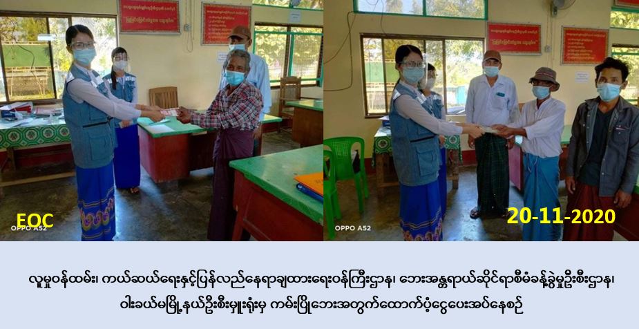 လူမှုဝန်ထမ်း၊ ကယ်ဆယ်ရေးနှင့် ပြန်လည်နေရာချထားရေးဝန်ကြီးဌာန၊ ဘေးအန္တရာယ်ဆိုင်ရာ စီမံခန့်ခွဲမှုဦးစီးဌာန၊ ဝါးခယ်မမြို့နယ်ဦးစီးမှူးရုံးမှ တာဝန်ရှိသူများသည် မြောင်းမြခရိုင်၊ ဝါးခယ်မ မြို့နယ်၊ အောက်ပေကုန်းကျေးရွာအုပ်စု၊ ကုန်းကြီးကျေးရွာတွင် (၁၈-၁၁-၂၀၂၀)ရက်နေနှင့် (၁၉-၁၁-၂၀၂၀)ရက်နေ့တို့တွင် ဖြစ်ပွားခဲ့သော ကမ်းပြိုဘေးကြောင့် ကြိုတင်ပြောင်းရွှေ့နေအိမ် (၃)လုံး၊ အိမ်ထာင်စု (၃)စုမှ လူဦးရေ (၁၁)ဦးတို့အတွက် အိမ်ဆောက်ပစ္စည်းဖိုး ထောက်ပံ့ငွေ (၃၀၀,၀၀ဝ/-)ကျပ်၊ ဆန်ရိက္ခာဖိုးထောက်ပံ့ငွေ (၂၃,၁၀ဝ/-)ကျပ်၊ စုစုပေါင်းထောက်ပံ့ငွေ( ၃၂၃,၁၀၀/-)ကျပ်အား (၂၀-၁၁-၂၀၂၀)ရက်နေ့၊ (၁၄း၃၀)နာရီအချိန်တွင် ဝါးခယ်မမြို့နယ်၊ အထွေထွေအုပ်ချုပ်ရေးဦးစီးဌာနတွင် ဘေးသင့်ပြည်သူများထံ သွားရောက်ထောက်ပံ့ ပေးအပ်ခဲ့ ကြောင်းသတင်းရရှိပါသည်။
