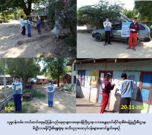လူမှုဝန်ထမ်း၊ ကယ်ဆယ်ရေးနှင့် ပြန်လည်နေရာချထားရေးဝန်ကြီးဌာန၊ ဘေးအန္တရာယ်ဆိုင်ရာ စီမံခန့်ခွဲမှုဦးစီးဌာန၊ မိတ္ထီလာခရိုင်ဦးစီးမှူးရုံးမှ တာဝန်ရှိသူများသည် (၂၀-၁၁-၂၀၂၀)ရက်နေ့တွင် သာစည်မြို့နယ်အတွင်းရှိ ကွမ်းခြံရိုးအုပ်စု (ကွမ်းခြံရိုး)၊ ဆည်ကြီးအုပ်စု (ဆည်ကြီးတောင်/ မြောက်)၊ ကြက်မောက်အုပ်စု (ကြက်မောက်၊ဇီးတော၊ကျောင်းရွာ၊သာစည်လေး၊ချမ်းသာကြီး) အပျောက်အုပ်စု(အပျောက်အရှေ့/အနောက်) ကျေးရွာများသို့လည်းကောင်း၊ မိတ္ထီလာမြို့နယ် အတွင်းရှိပျဥ်သာအုပ်စု (ပျဥ်သာ၊ ကျိတ်ပုလဲ၊ သဲကုန်း)၊ ကဖြူအုပ်စု(ညောင်ကားယား၊ကဖြူ) ရှမ်းတဲအုပ်စု(ရှမ်းတဲ၊ ဂွေးကုန်း၊ ထိန်တောအိုင်၊ ရွာသာအေး၊ ကိုက္ကိုပင်၊ ဆည်ခြား၊ ရွာသစ်) ညောင်ကန်အုပ်စု(ဓမ္မပါလ)ကျေးရွာများရှိ ပြည်သူများသို့ Covid-19 ကူးစက်ရောဂါနှင့် သဘာဝဘေးအန္တရာယ်ဆိုင်ရာ ဆောင်ရန်/ ရှောင်ရန်အချက်များအား အသိပညာပေး ဆောင်ရွက်ခဲ့ကြောင်း သတင်းရရှိပါသည်။